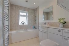 Double glazed window to the rear aspect. Inset spotlighting. Extractor fan. Suite comprising; bath with a digital shower and screen. Vanity unit with wash hand basin and concealed low level WC. Heated towel rail. Part tiled walls. Wood effect vinyl flooring.