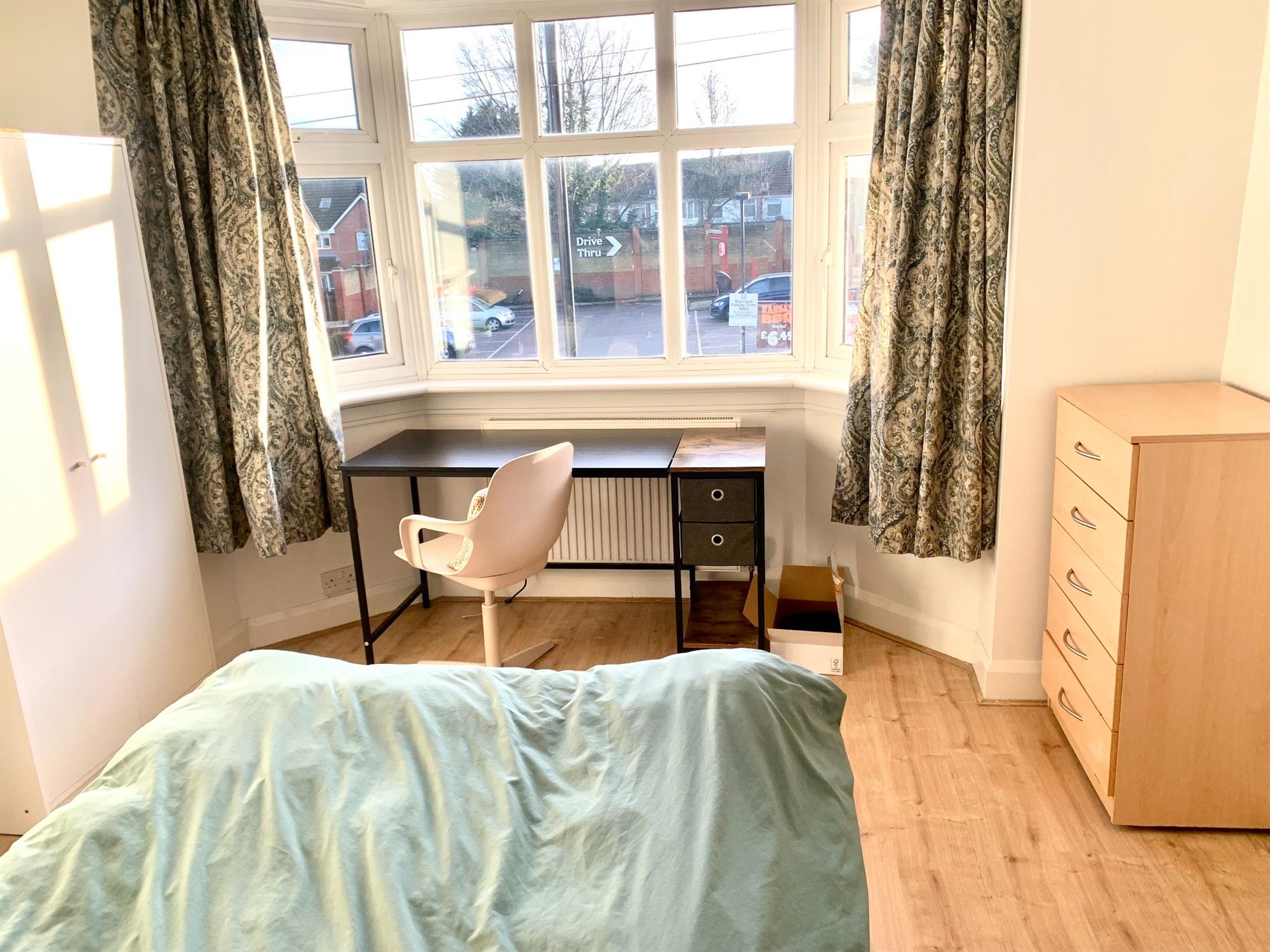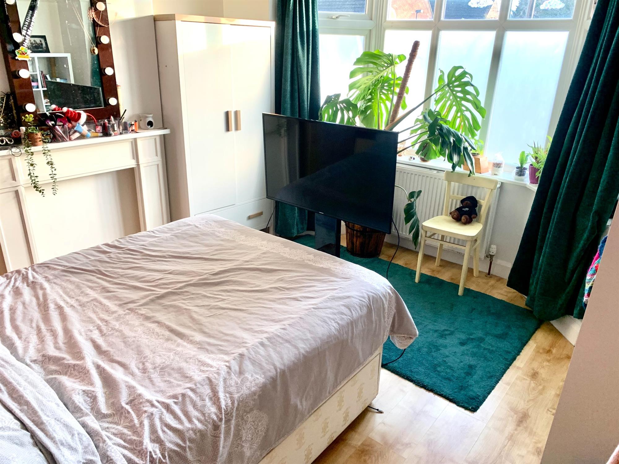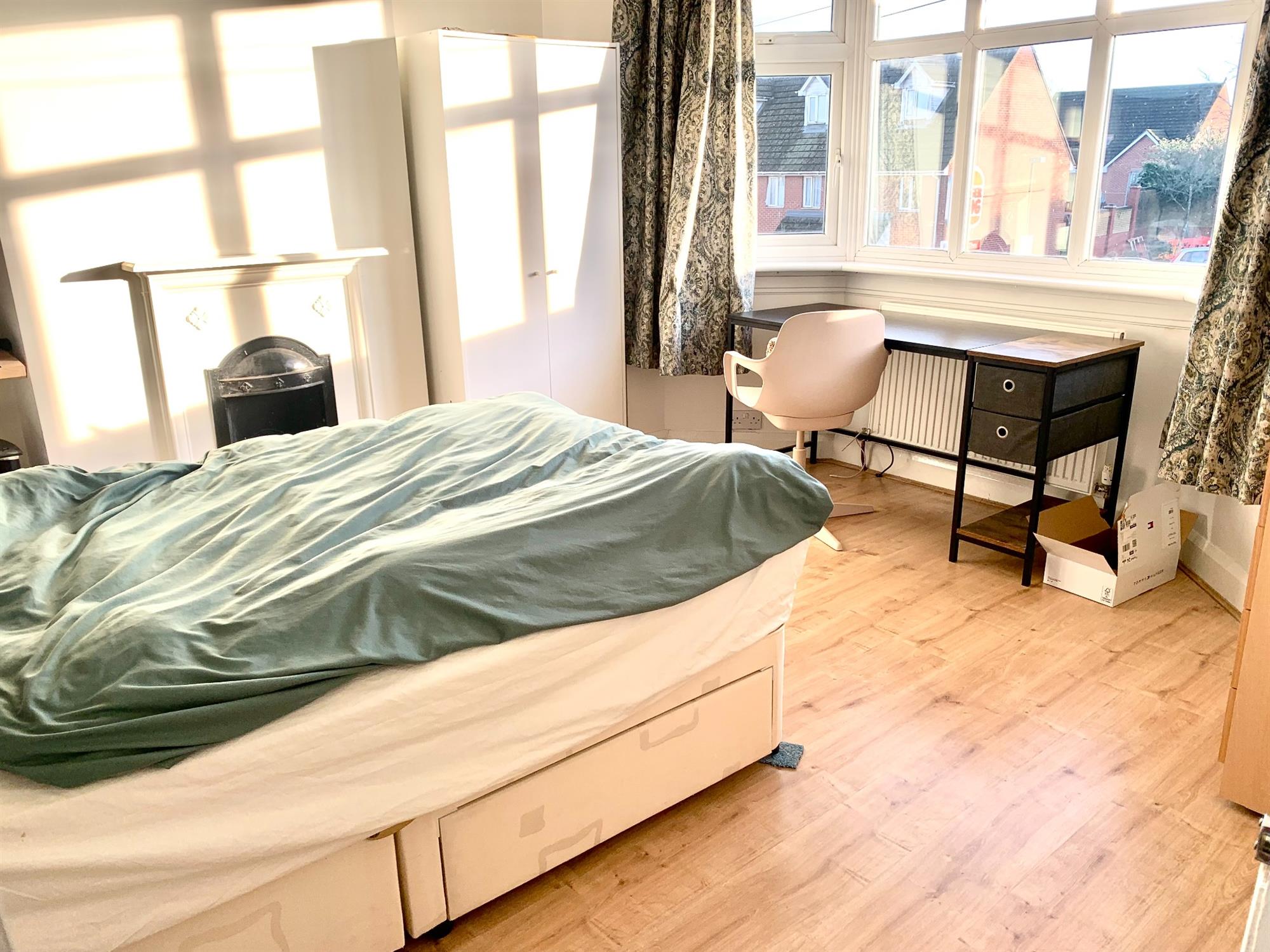 BEDROOM 1 – Double bedroom with laminate flooring, bay window to front and ornamental fireplace. Furnishing consist of drawers, wardrobe and desk.