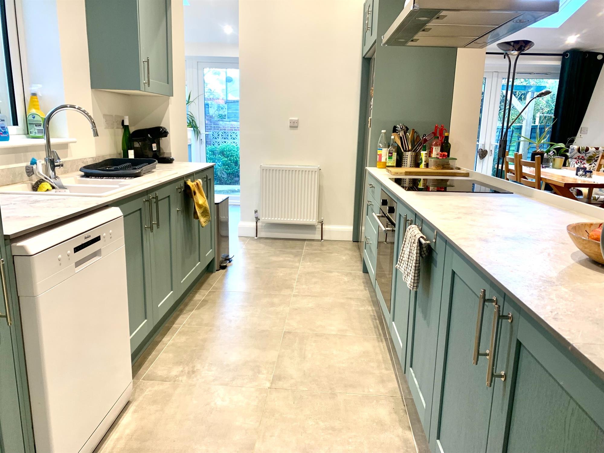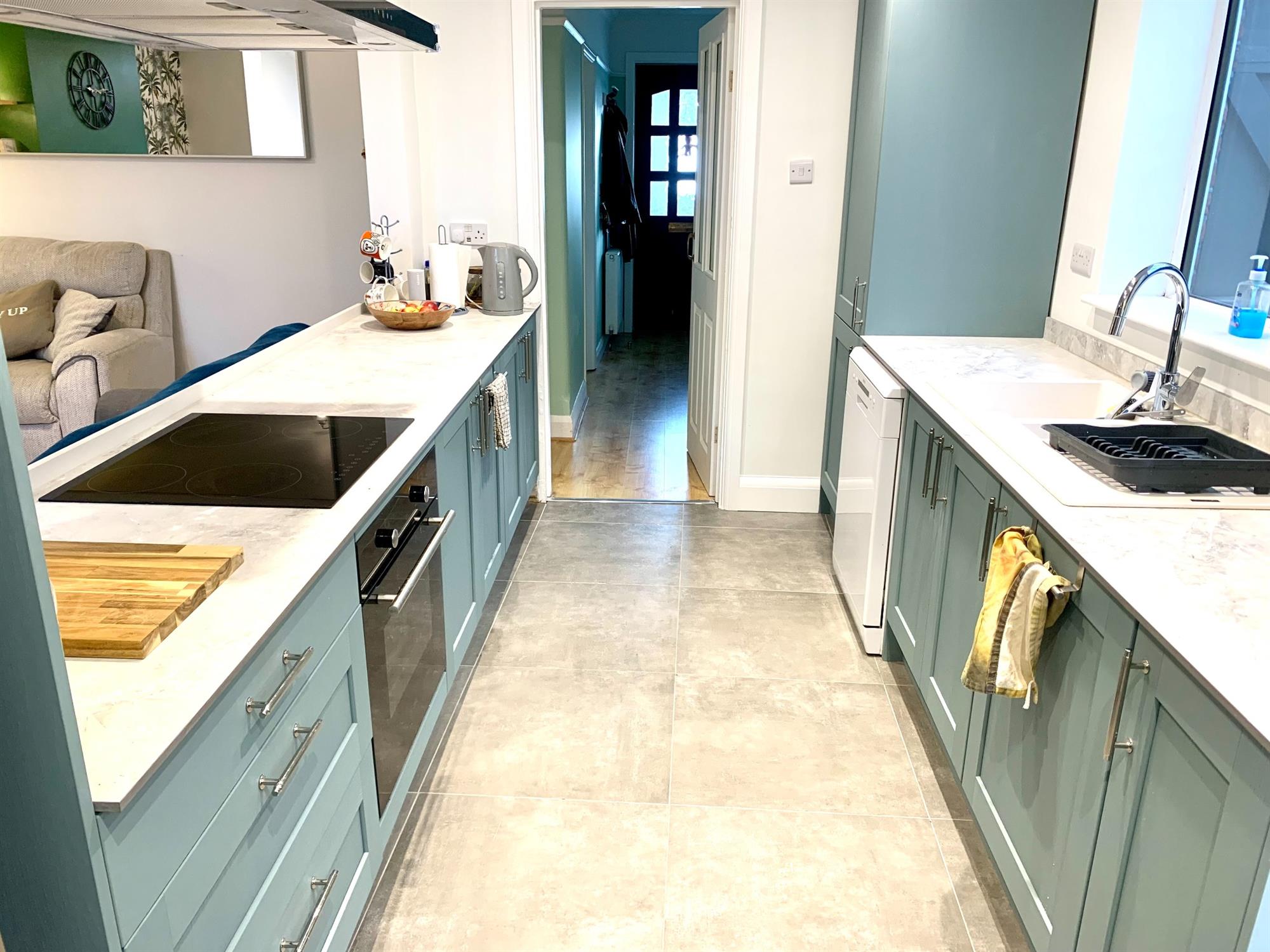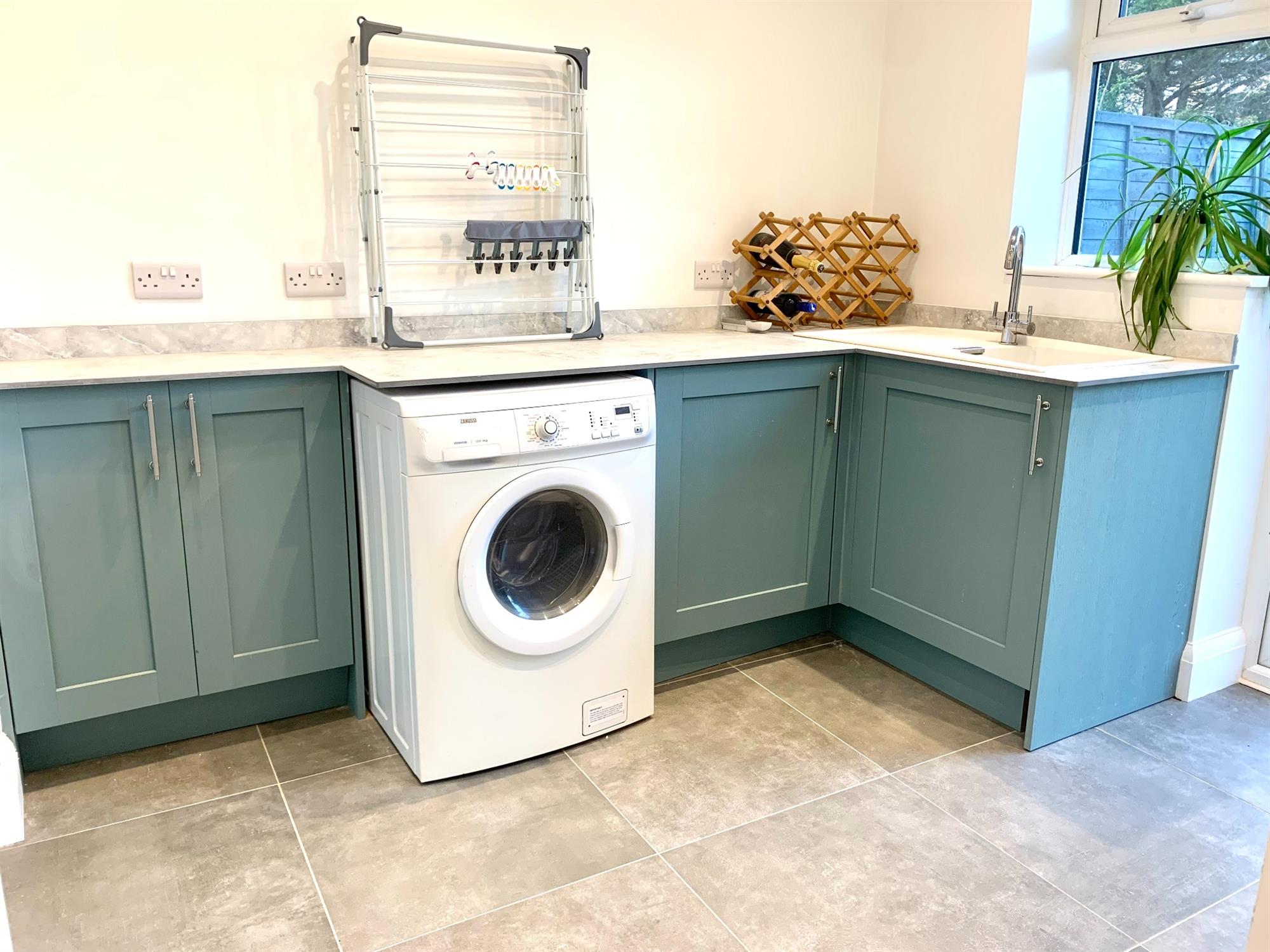 UTILITY AREA – Tiled flooring with door to storage area, door to garden and door to shower room. Kitchen units with sink inset with appliance consisting of washing machine and window to rear.