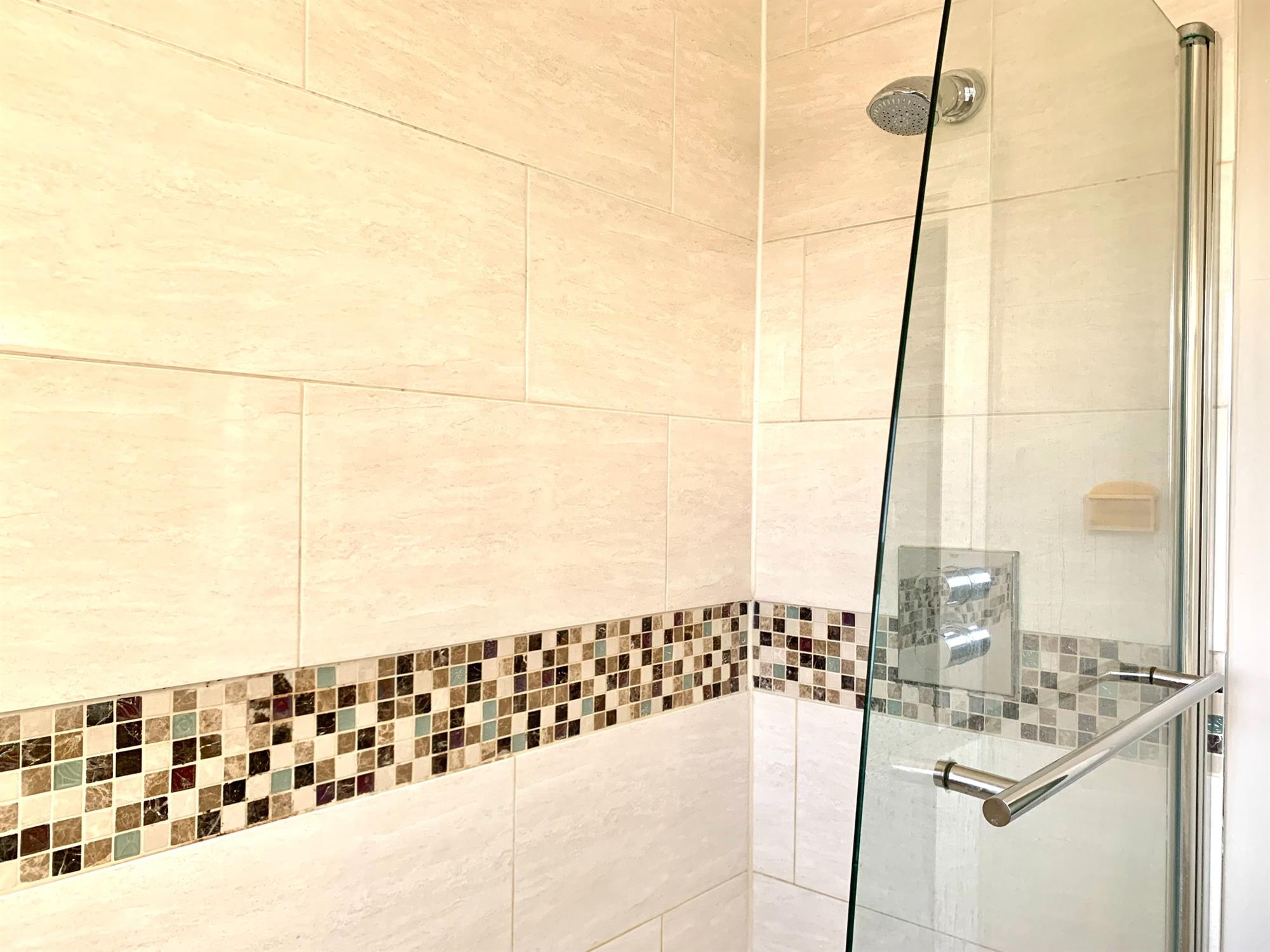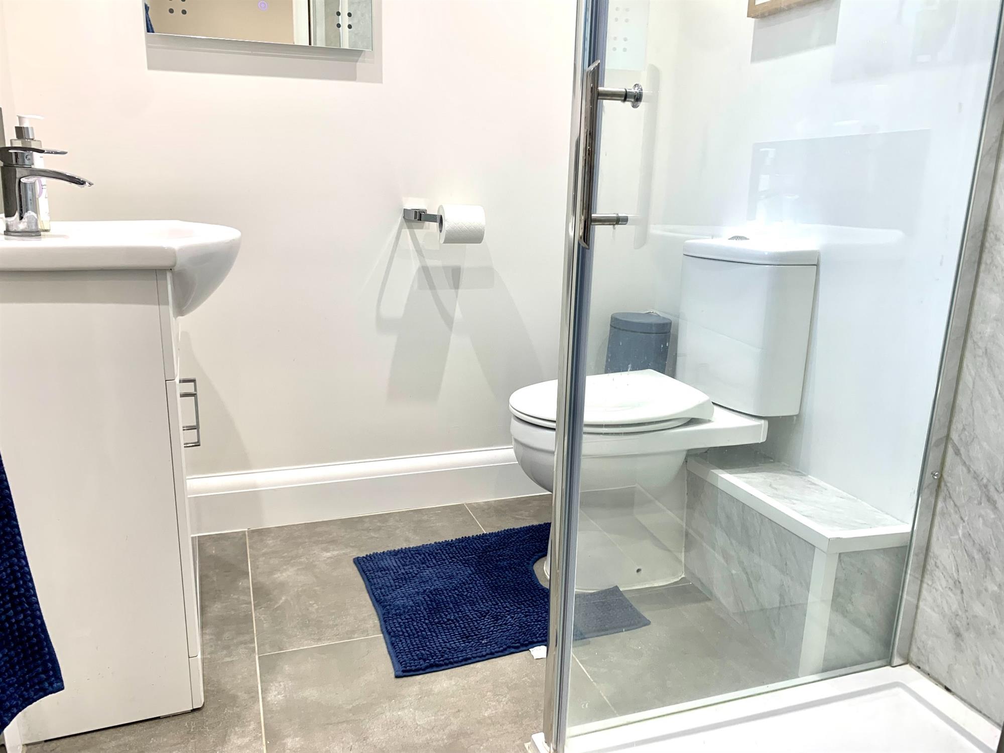SHOWER ROOM – White suite shower room with shower cubicle, toilet and sink inset in vanity unit. Window to rear.