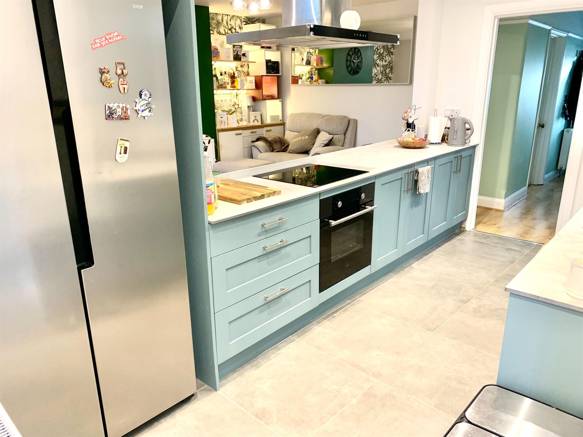 KITCHEN – Open plan to the lounge with laminate flooring, window to side and opens out to utility area. Various kitchen units with appliances consisting of: electric hob, hob extractor fan, electric oven, dishwasher and American style fridge/freezer.