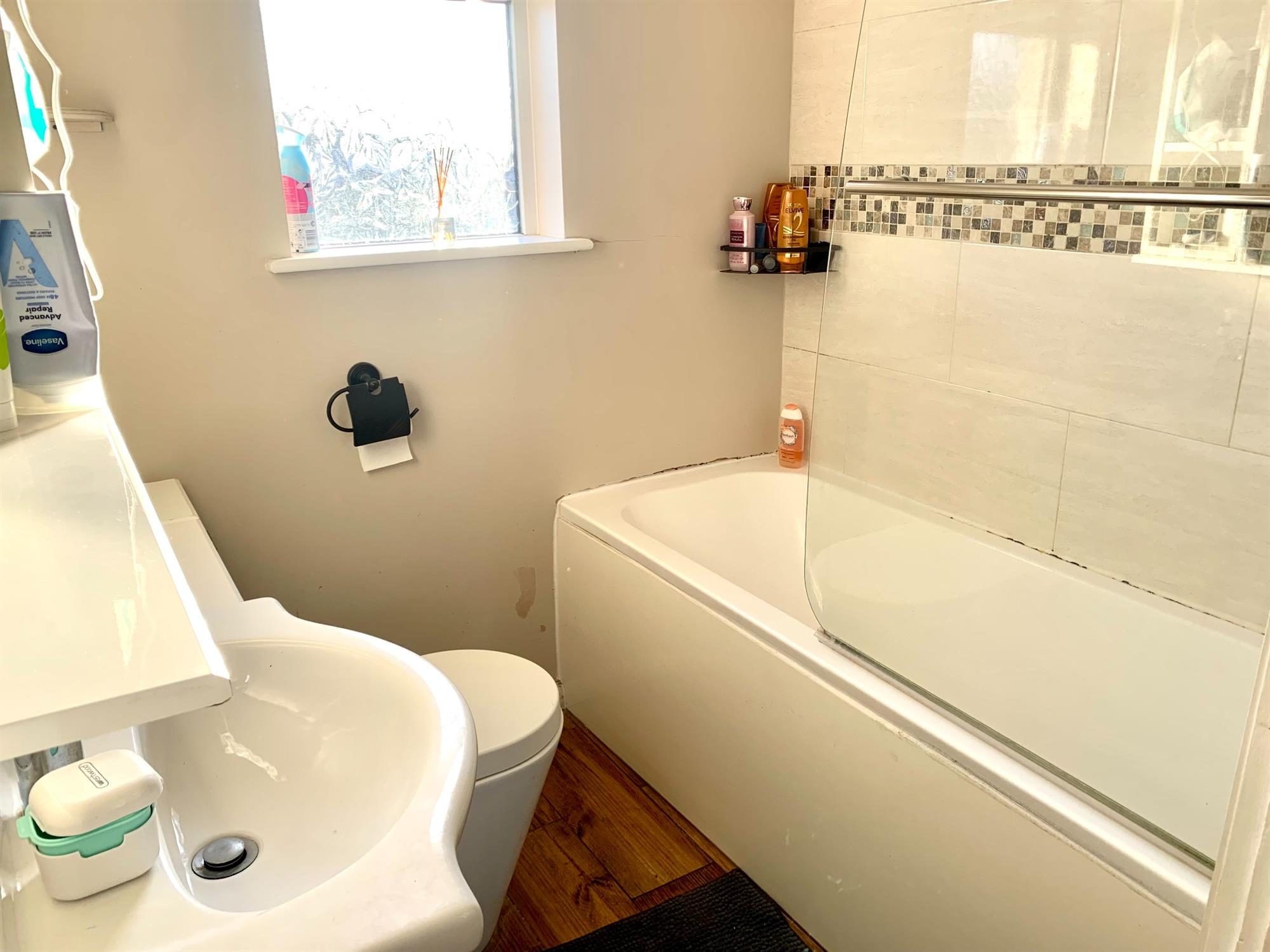 BATHROOM – White suite with toilet, sink and bath with shower over. Window to front.