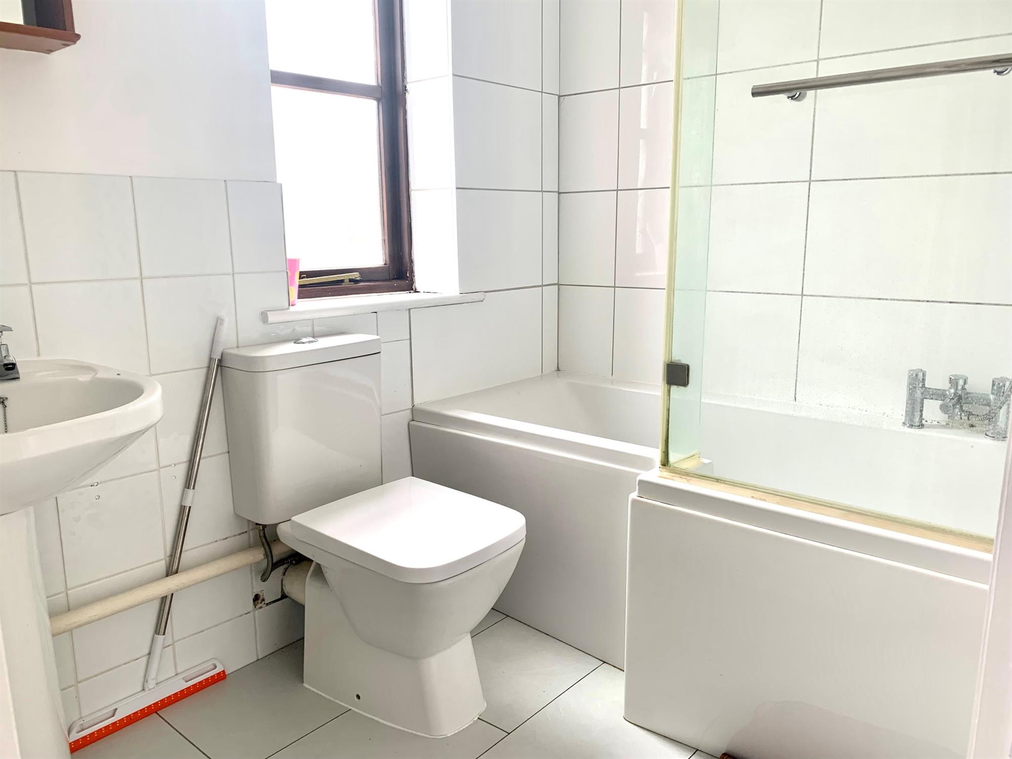 Located to side of the property with white suite which includes, bath with shower over, sink and toilet. Window to side.
