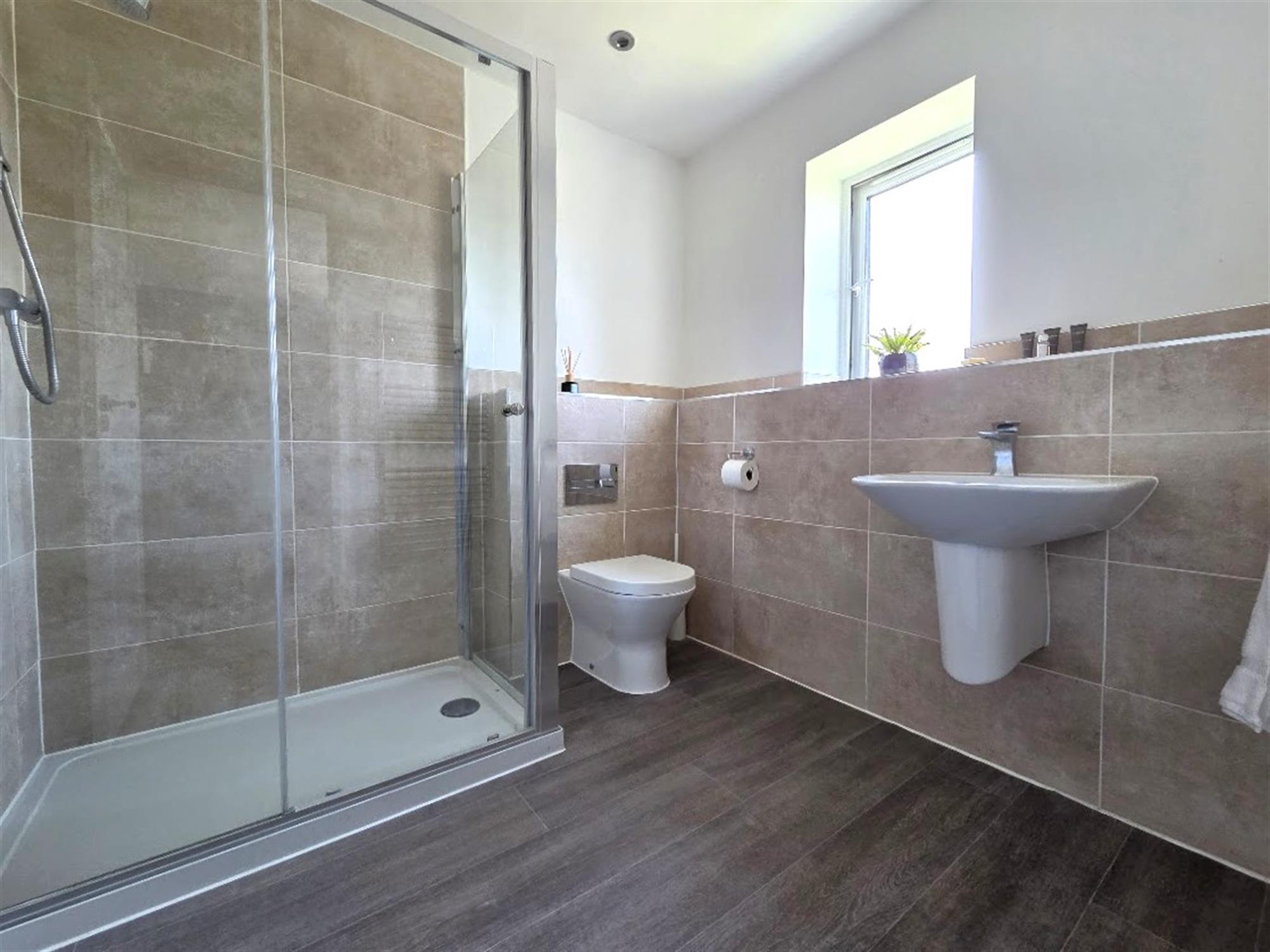 Double-glazed opaque window to the rear aspect. Low-level WC. Wall-mounted wash basin with chrome mixer tap. Partly tiled walls. Inset spotlights, extractor fan. Panelled bath with fitted hand-held chrome shower attachment. Chrome ladder-style heated towel rail. Double-width walk-in shower. Vinyl flooring.
