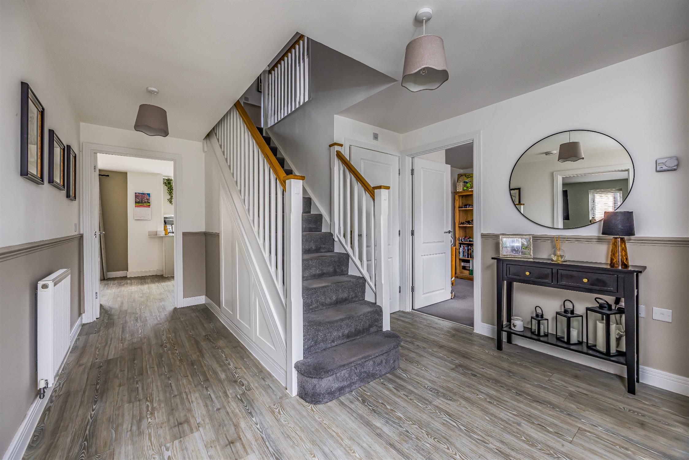 Composite door with double-glazed opaque inserts. Stairs rising to the first floor, under stairs' storage cupboard, radiator. Double-glazed opaque window to the front aspect. Inset coir floor matting. Amtico flooring. Doors to: