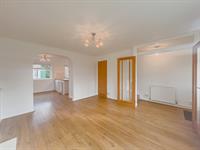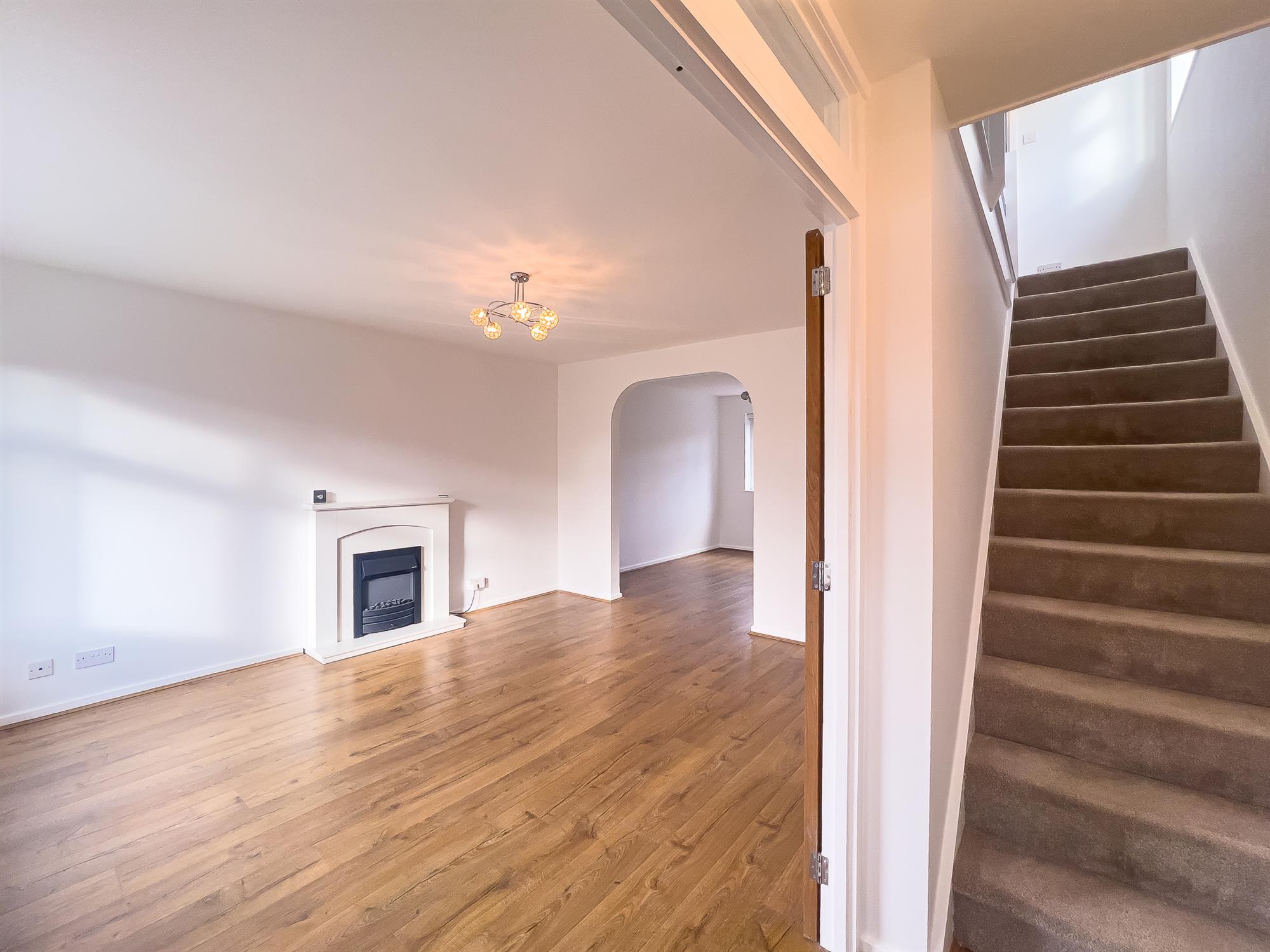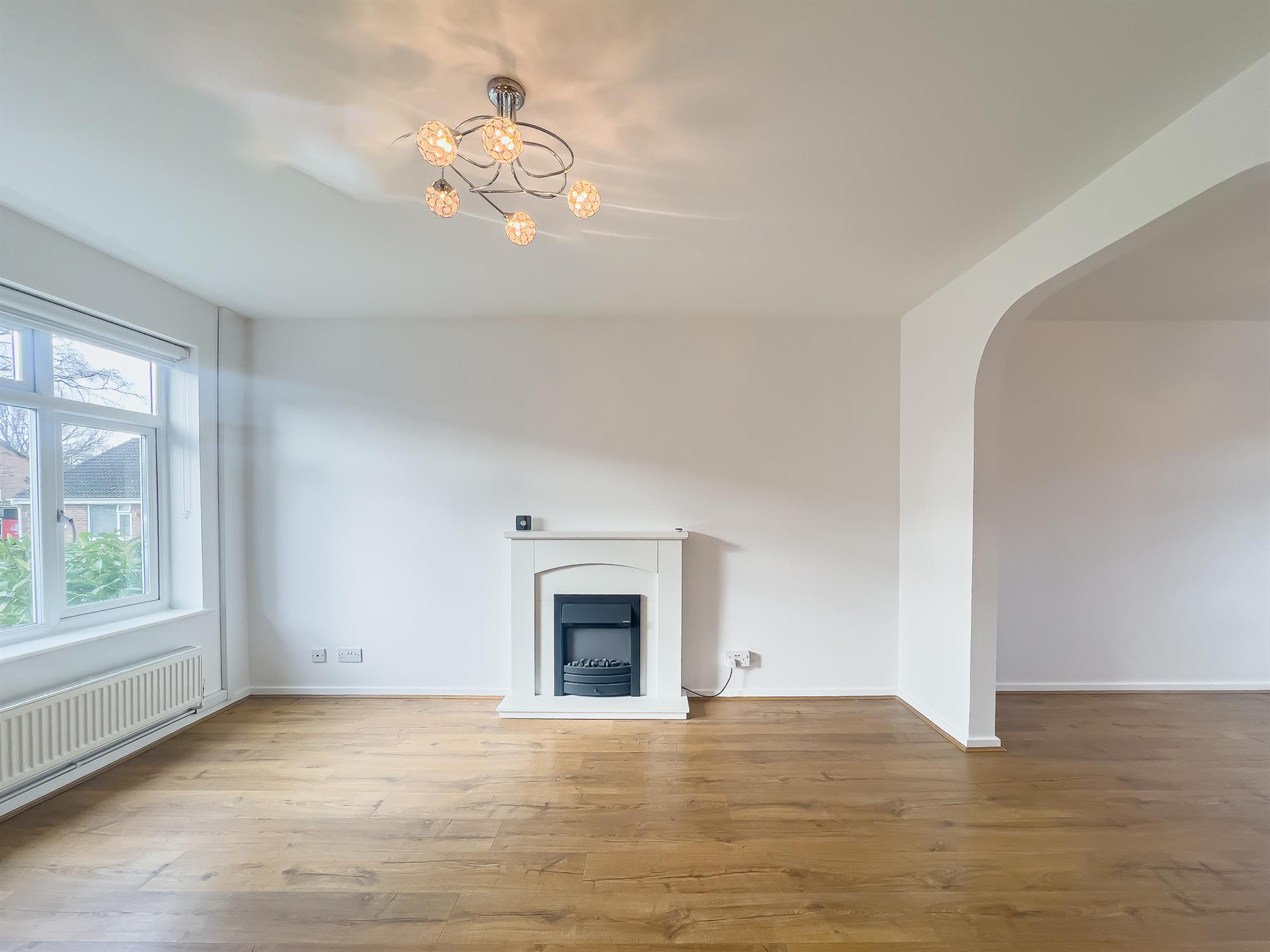 A bright and airy room with a large window to the front and a feature fireplace housing an electric fire. A large opening provides access to the dining room.