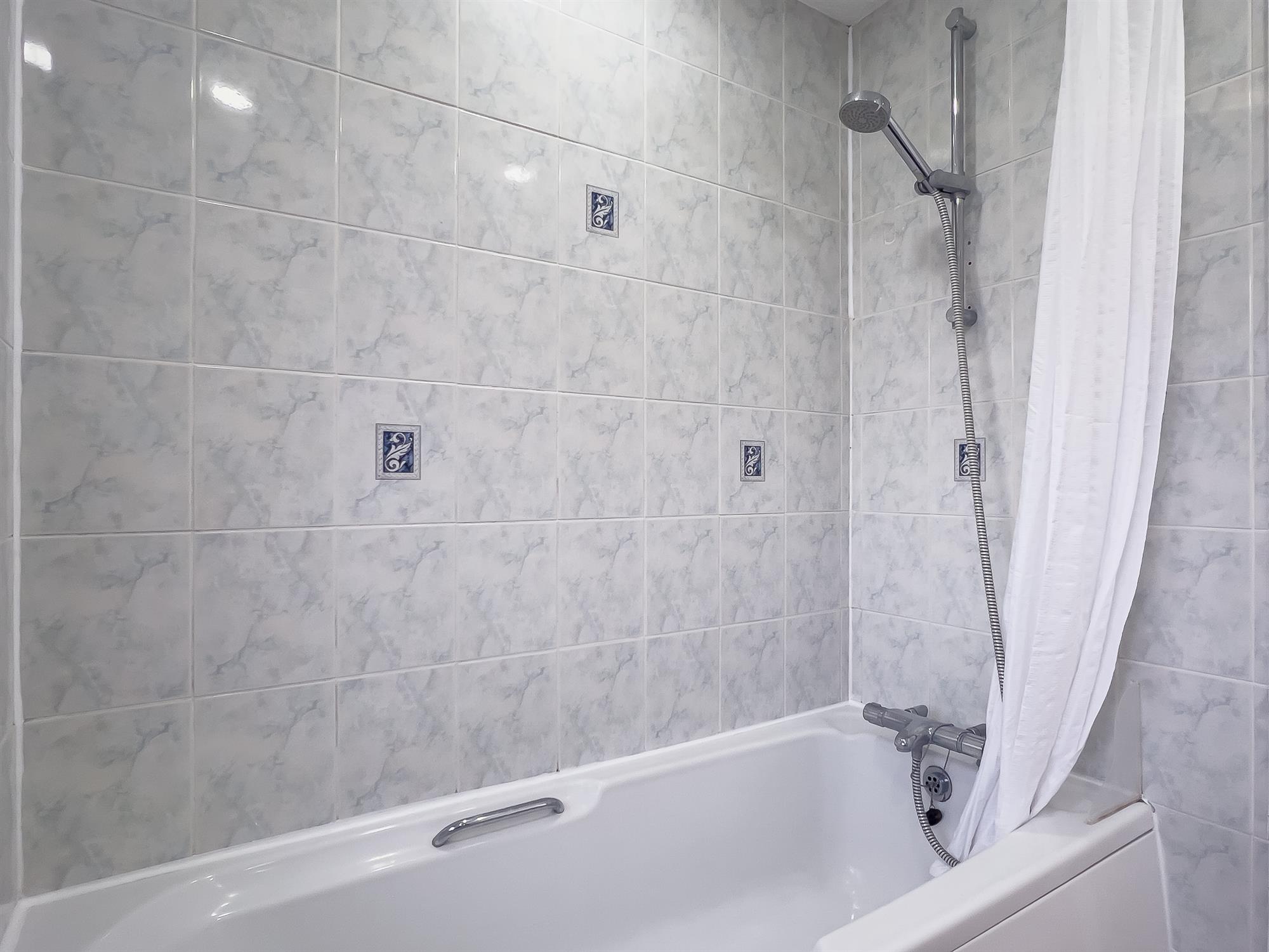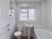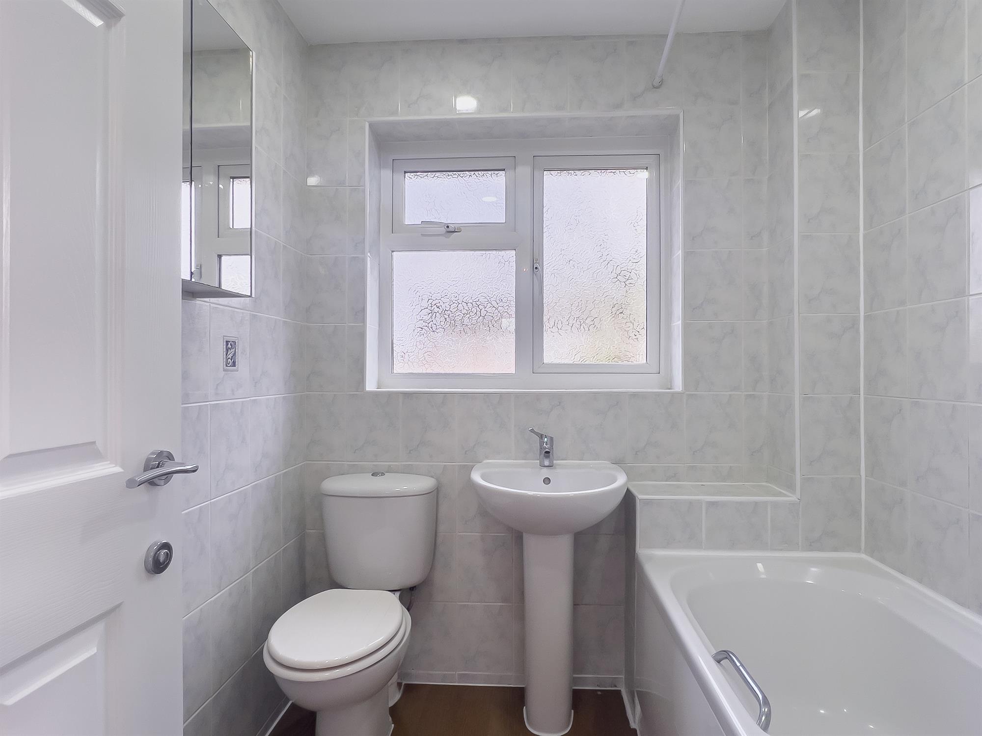 Fitted with a panelled bath, wall-mounted shower, WC, and hand basin. Tiling to surrounds and a screen window to rear.
