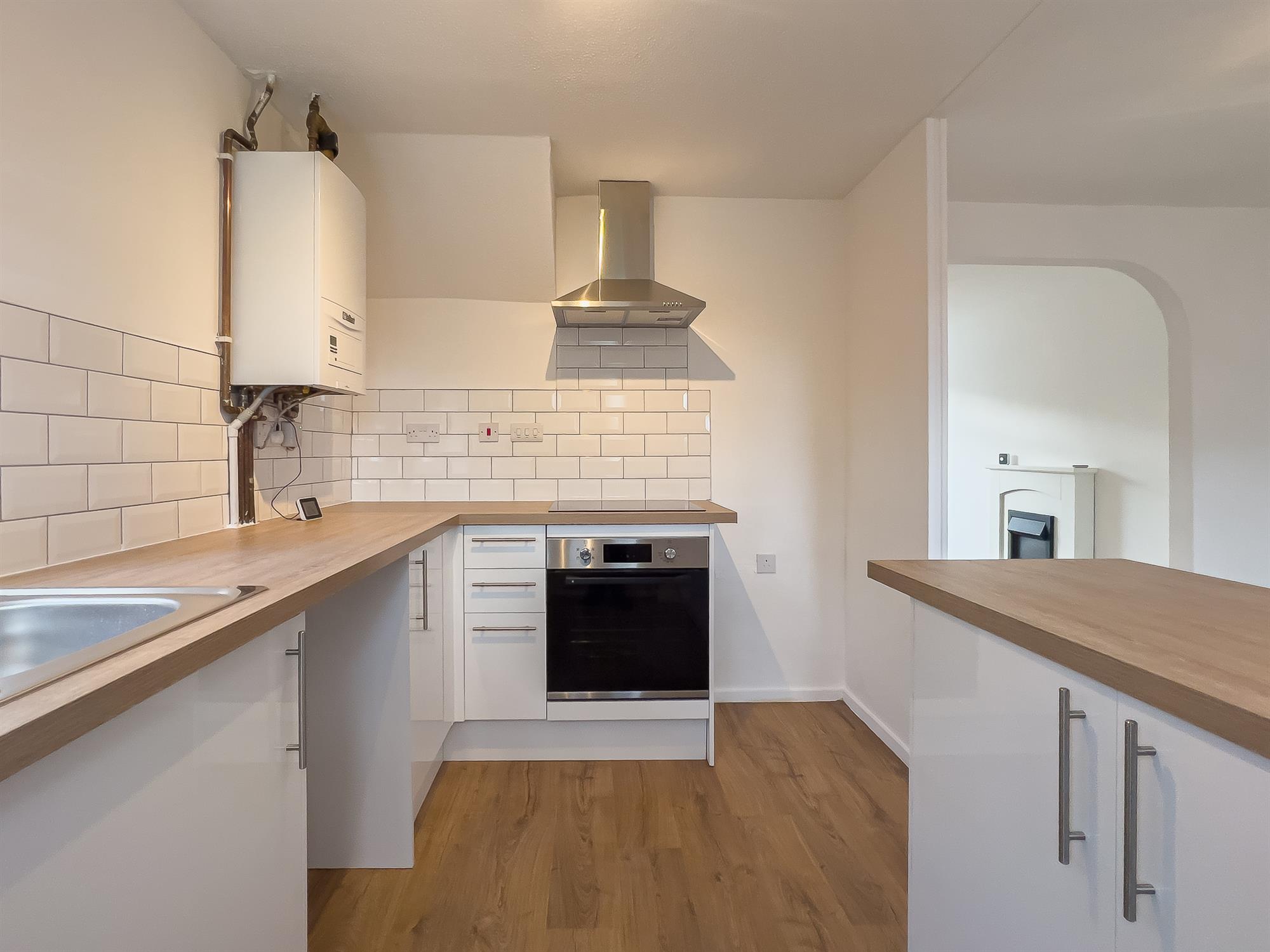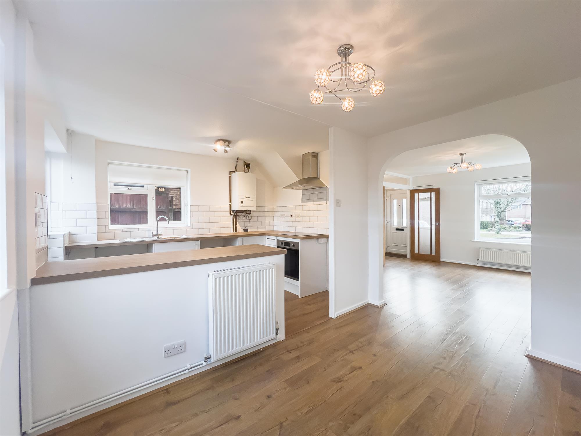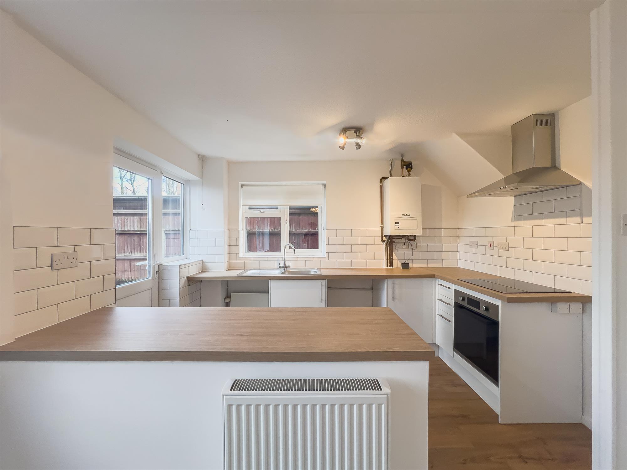 Fitted with cupboards and drawers at base and eye level, including a built-in oven and induction hob. Space is available for a fridge freezer, washing machine, dishwasher, and tumble dryer. Doors and windows overlook the rear and side gardens.