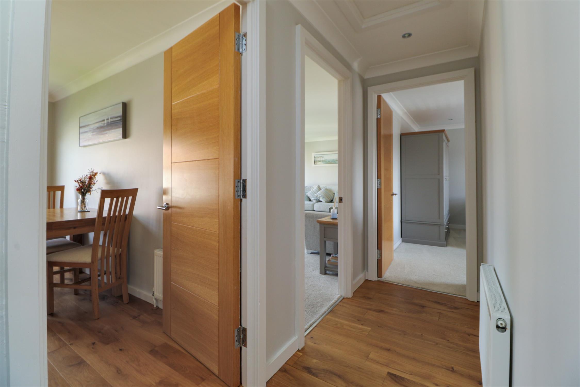Smooth and coved ceiling with inset spotlights, intercom entry system, airing cupboard, radiator, wood flooring.
