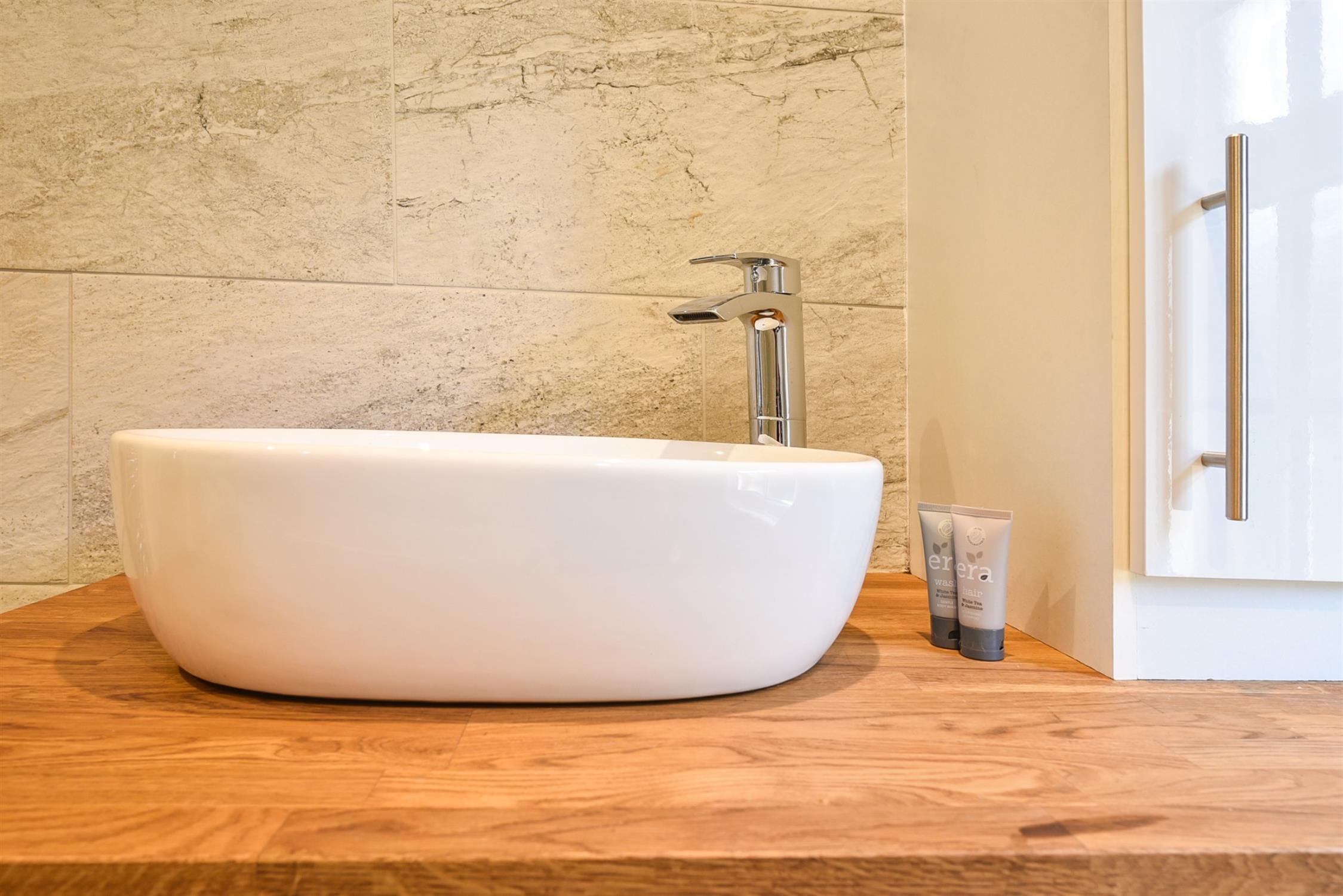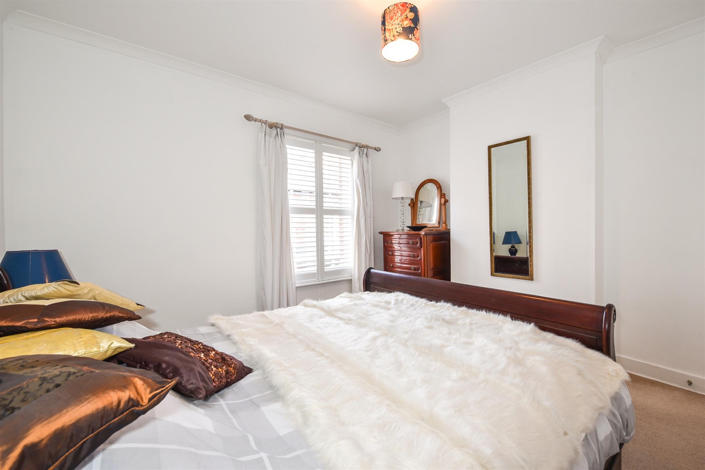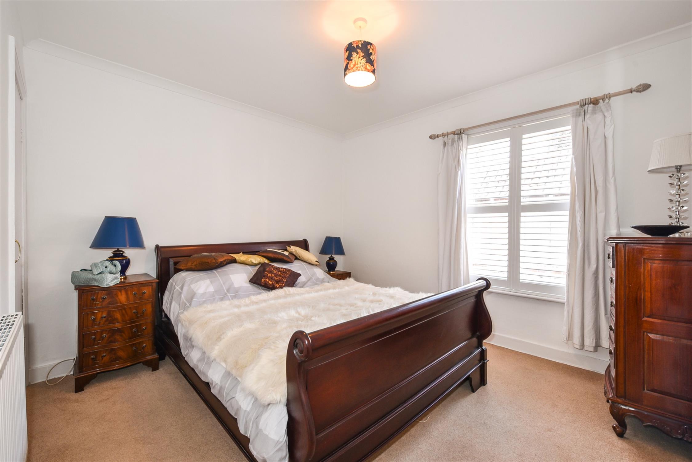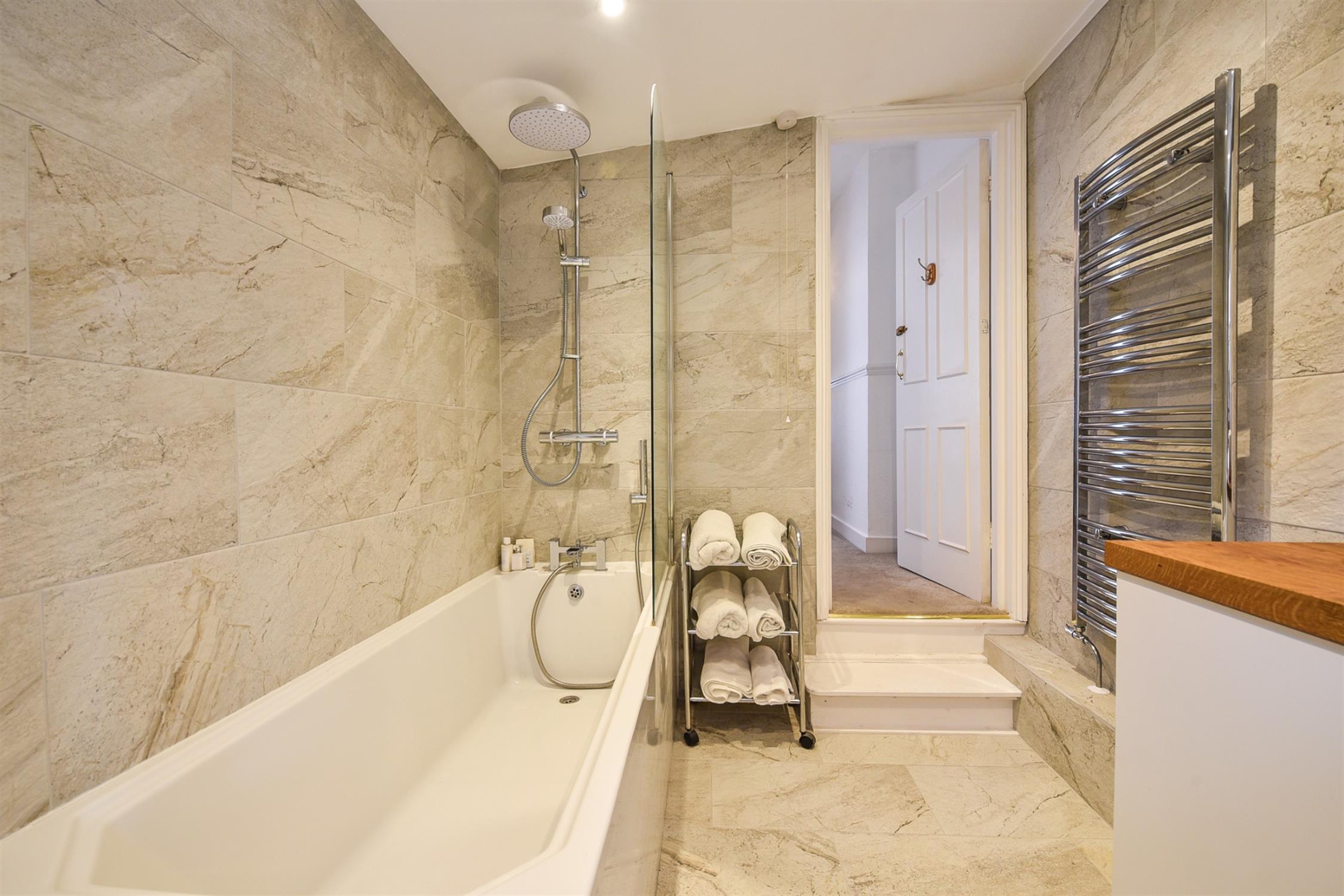 On the first floor, there are two bedrooms. Bedroom one is a double and is fitted with built in storage cupboard and white bespoke shutters. The bathroom is contemporary in style and is fitted with waterfall shower over bath, toilet, heated towel rail, and vanity unit with storage.
