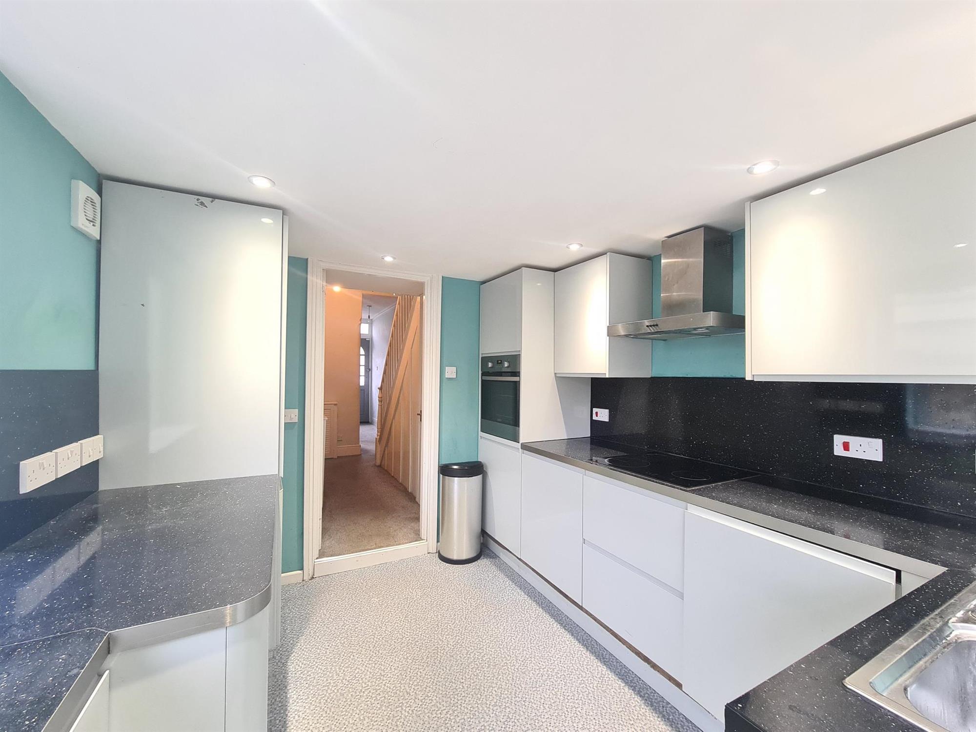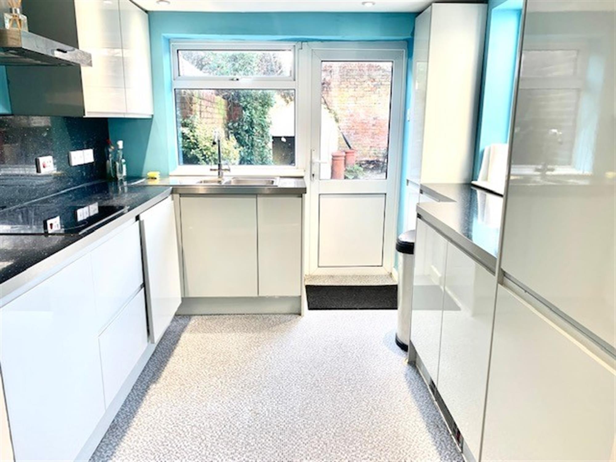 KITCHEN - 10' 11" (3.34m) x 9'4" (2.85m) Modern white gloss kitchen with access to the garden. Appliances consist: electric hob, electric oven, integral fridge/freezer, integral dishwasher and integral washing machine.