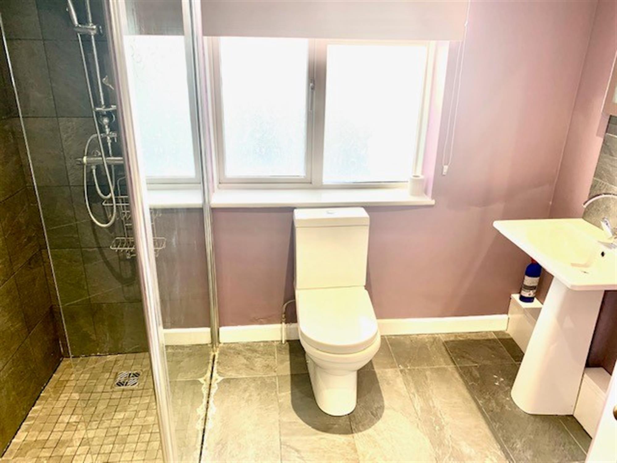 SHOWER ROOM - Spacious walk in shower with wash basin, toilet and storage cupboard.
