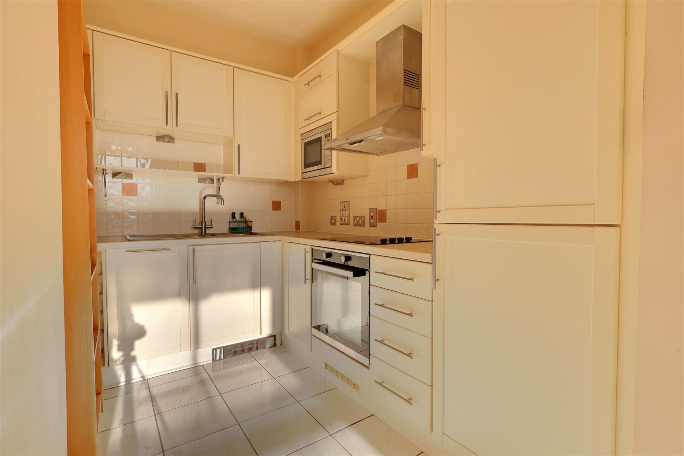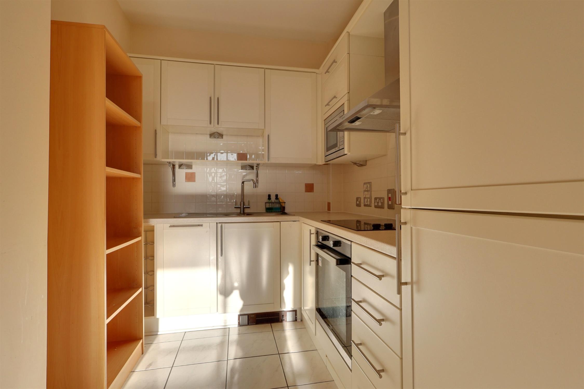 A range of wall and base cupboards with work surfaces over. Four ring electric hob with extractor fan. Integrated fridge, freezer, oven, microwave and dishwasher. One and a half-inset chrome sink with drainer, tiled flooring, smooth ceiling with recess lighting.