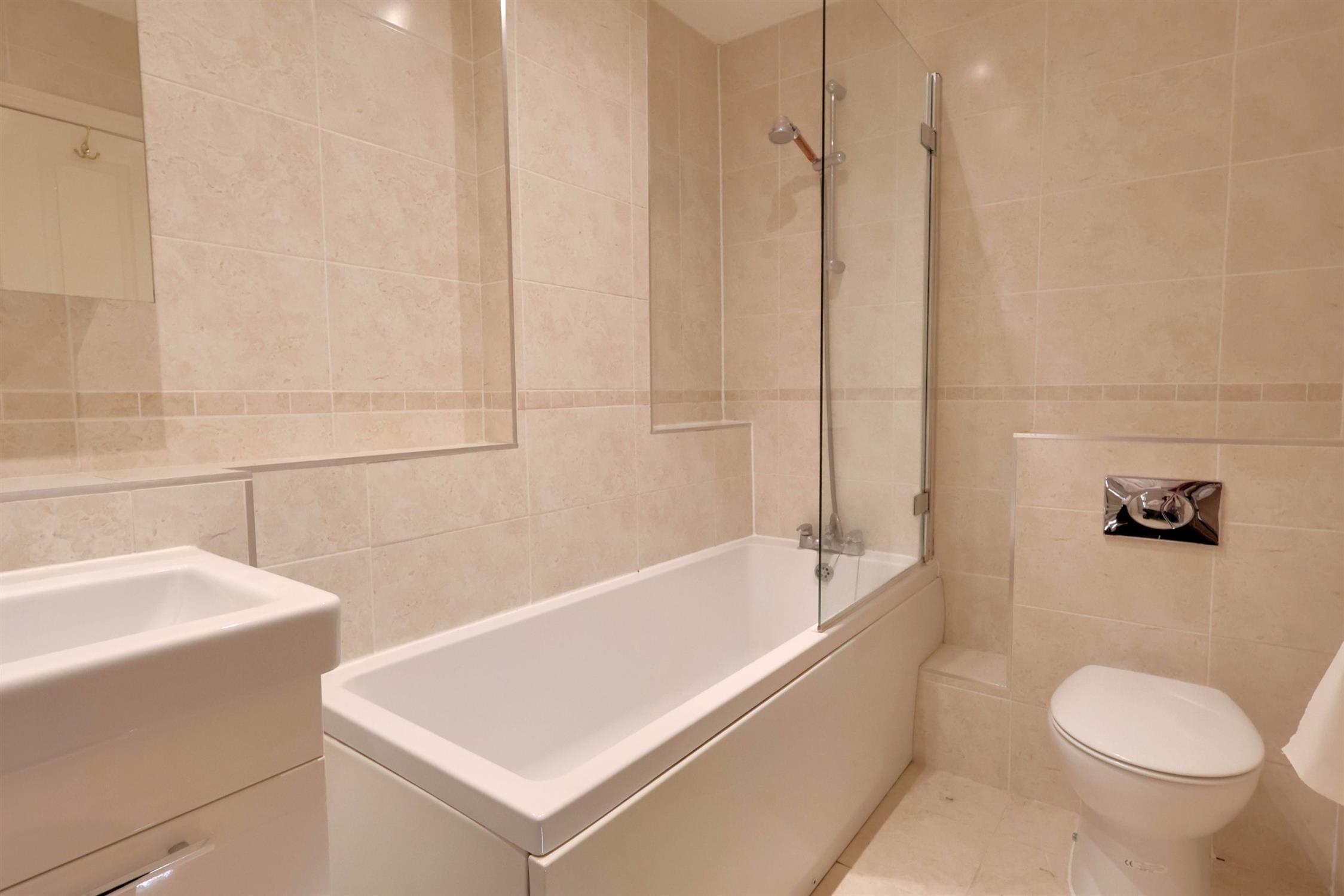 Paneled bath with screen and shower attachment, low level w.c. and ceramic sink with cupboard under. Vanity unit. Heated towel rail. Tiled Flooring.