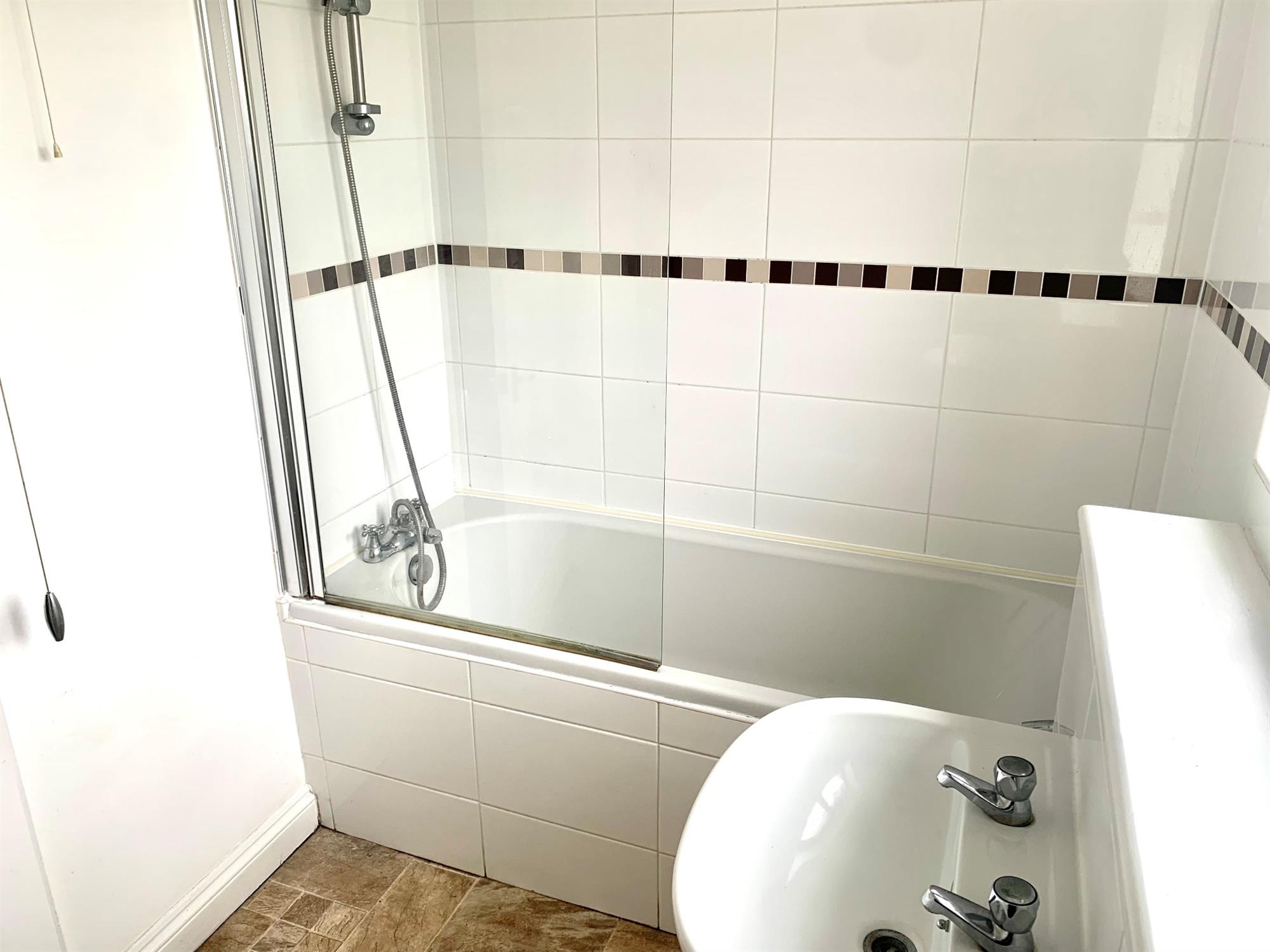 A white three-piece suite with shower over the bath, a basin and a W.C.