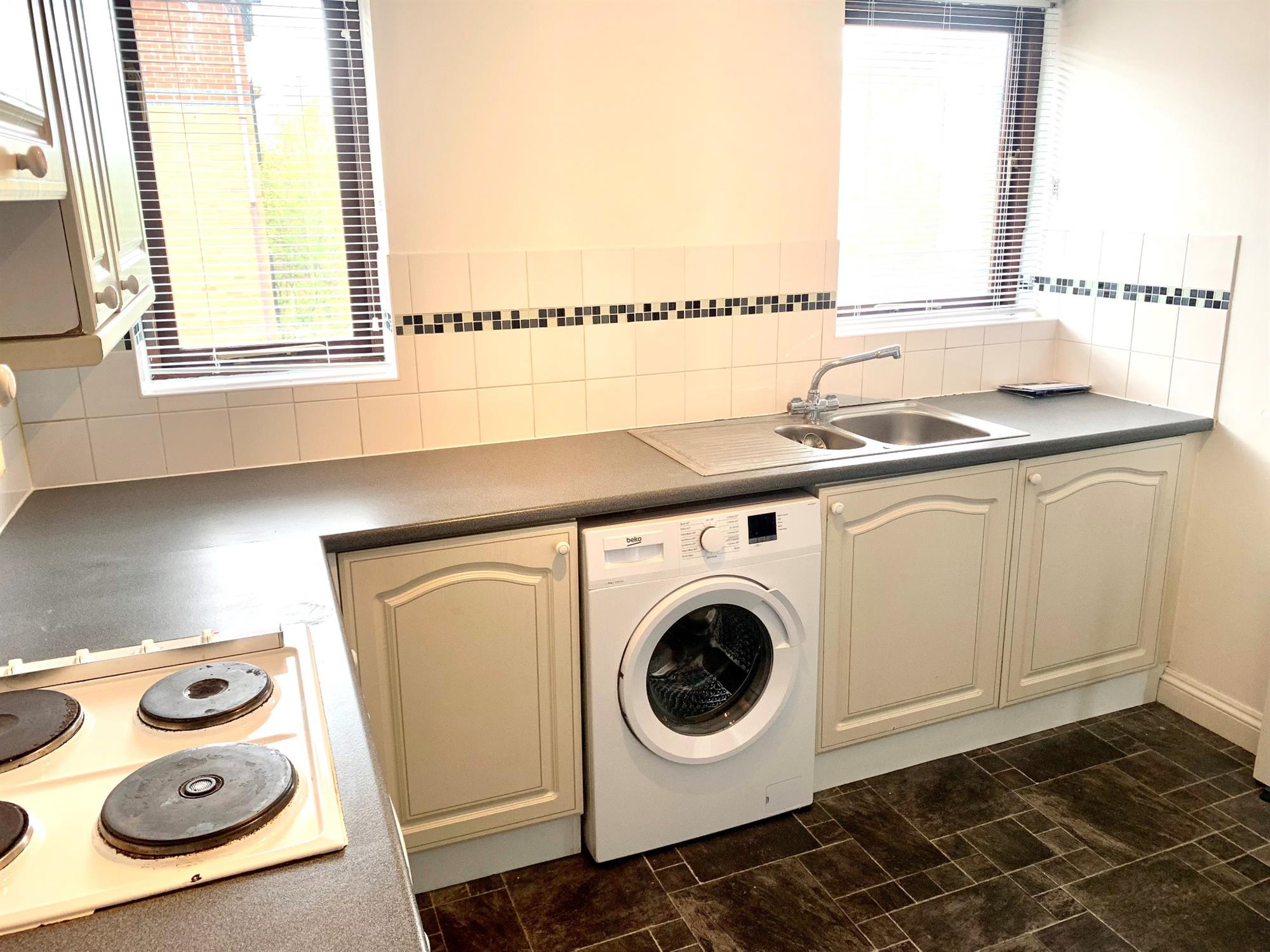 Wall and base units with a window to the rear. Appliances consist of an electric hob, an electric oven, a washing machine and a fridge/freezer.