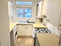 An older style kitchen with various wall and base units with a window overlooking the communal gardens. Appliances consist of a washing machine and an electric oven and hob. The kitchen also houses the combi-boiler.