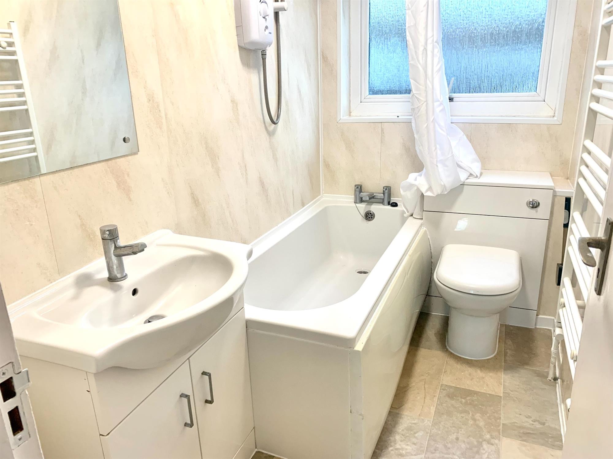 A white three-piece suite with shower over bath, a basin and a WC with a window to the side.