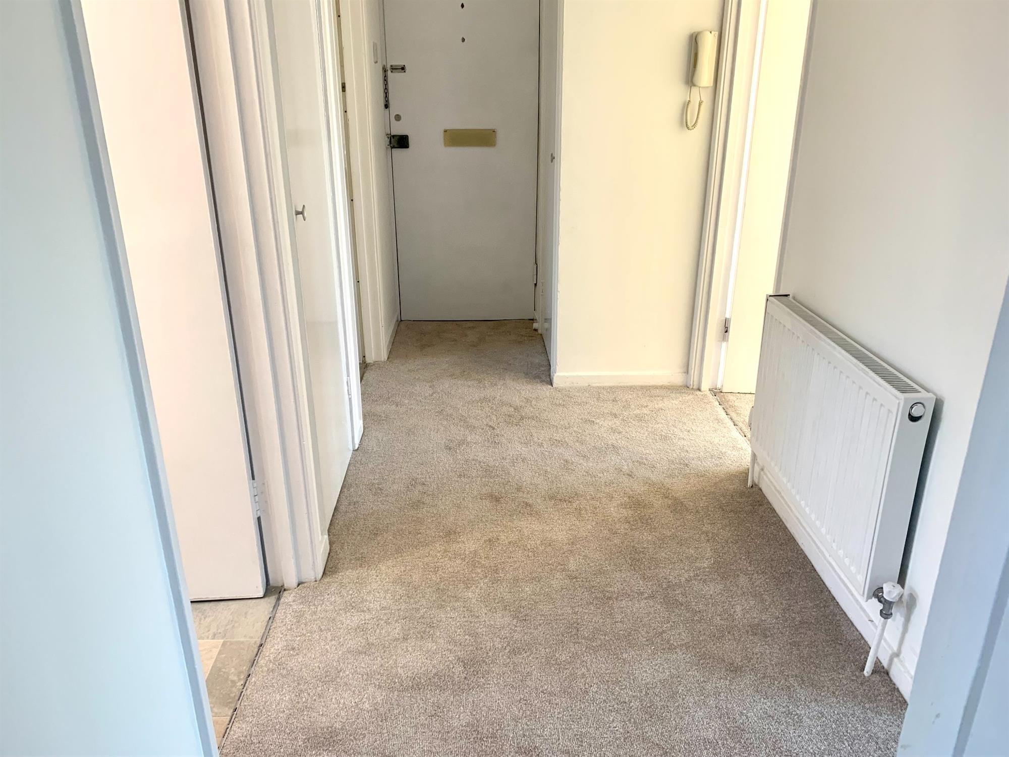 Carpet flooring with storage cupboard housing the fridge/freezer and doors to all bedrooms.