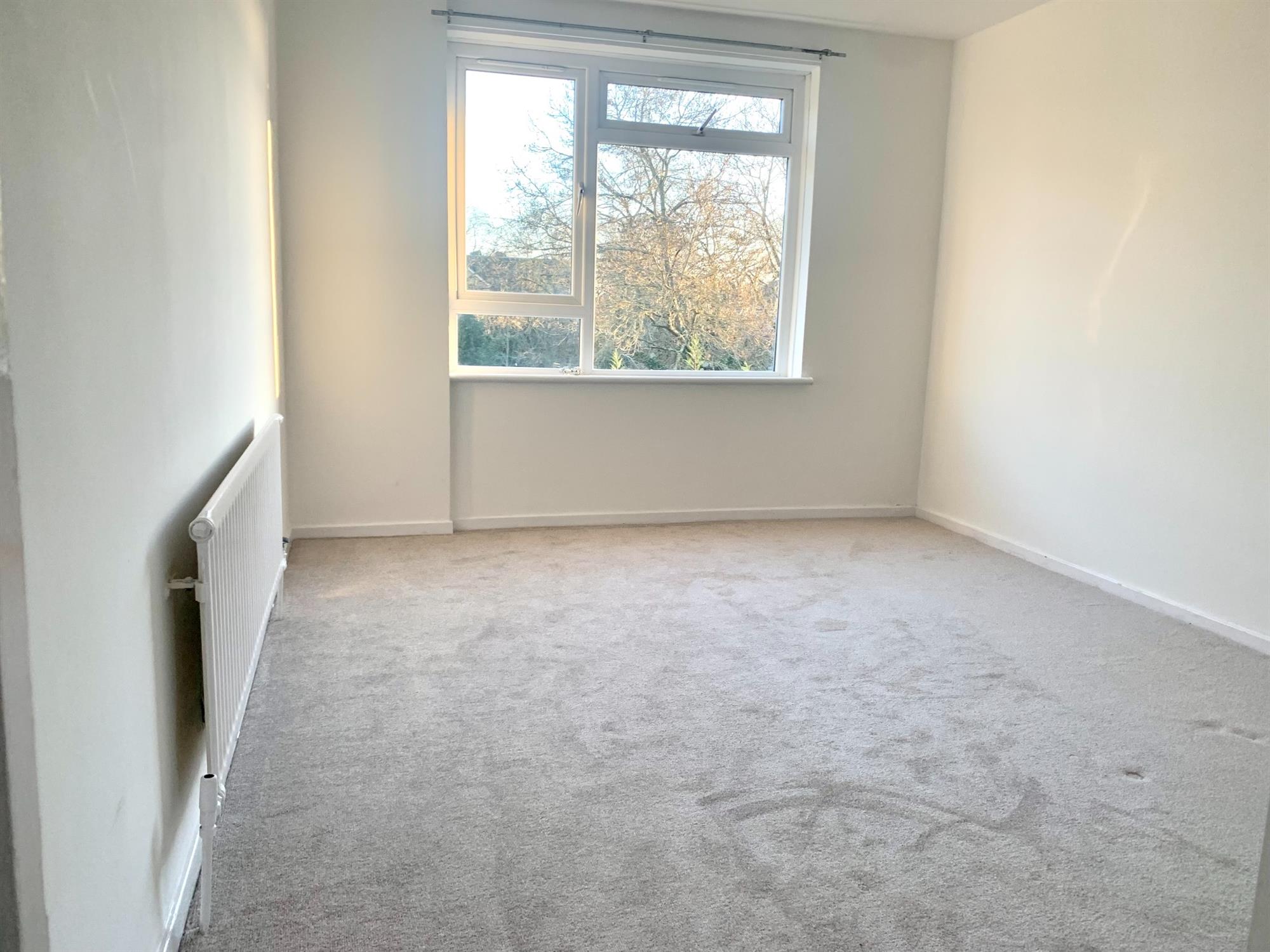 A large single bedroom with carpet flooring and a window overlooking the communal garden.