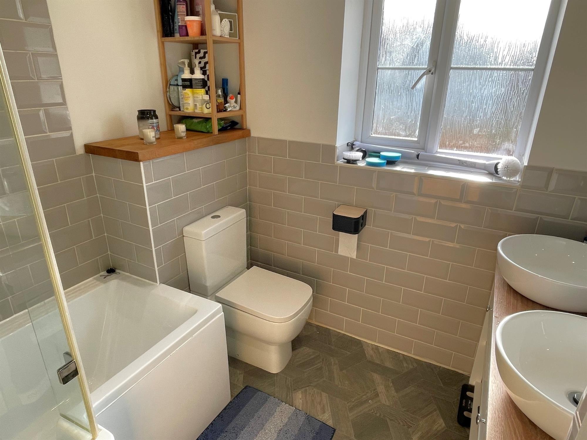 Window to front. Low level WC. His and hers wash hand basins with cupboards below. Shaped bath with central taps and shower over. Glazed screen. Complementary tiling. Heated towel radiator.