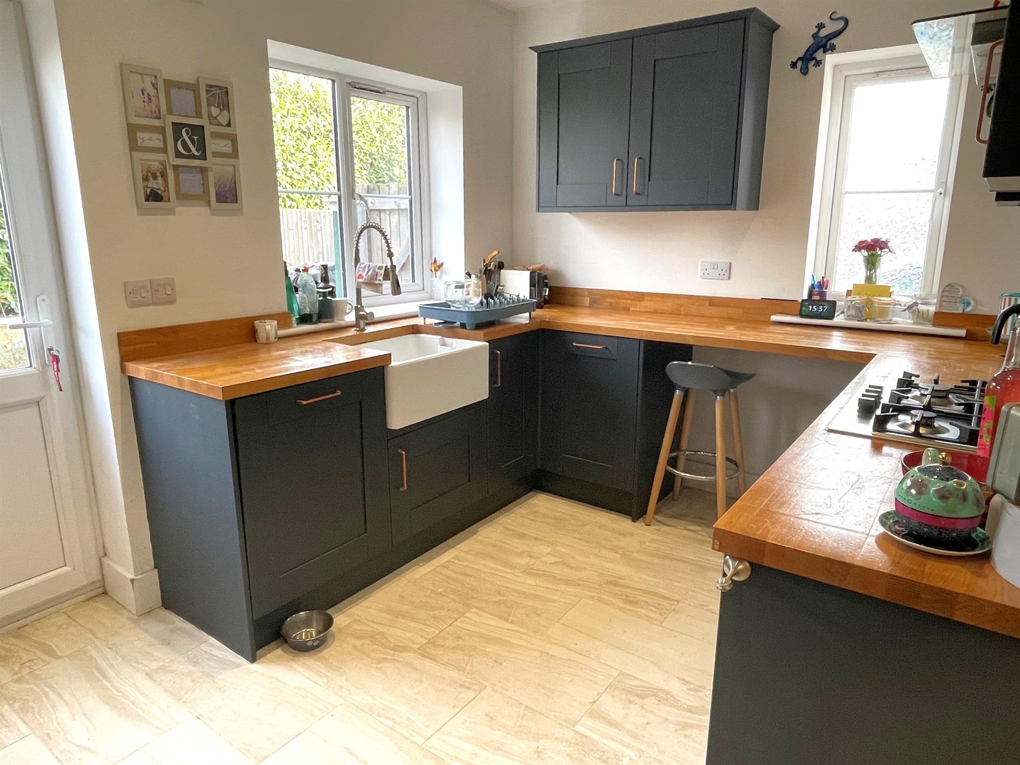 Windows to rear and side. Range of wall and base units with work surfaces over. Butler sink. 4 ring gas hob with extractor over. Built-in electric oven with combination microwave above. Integrated fridge freezer. Dishwasher and washer/dryer. Breakfast bar, underfloor heating. Door to garden.