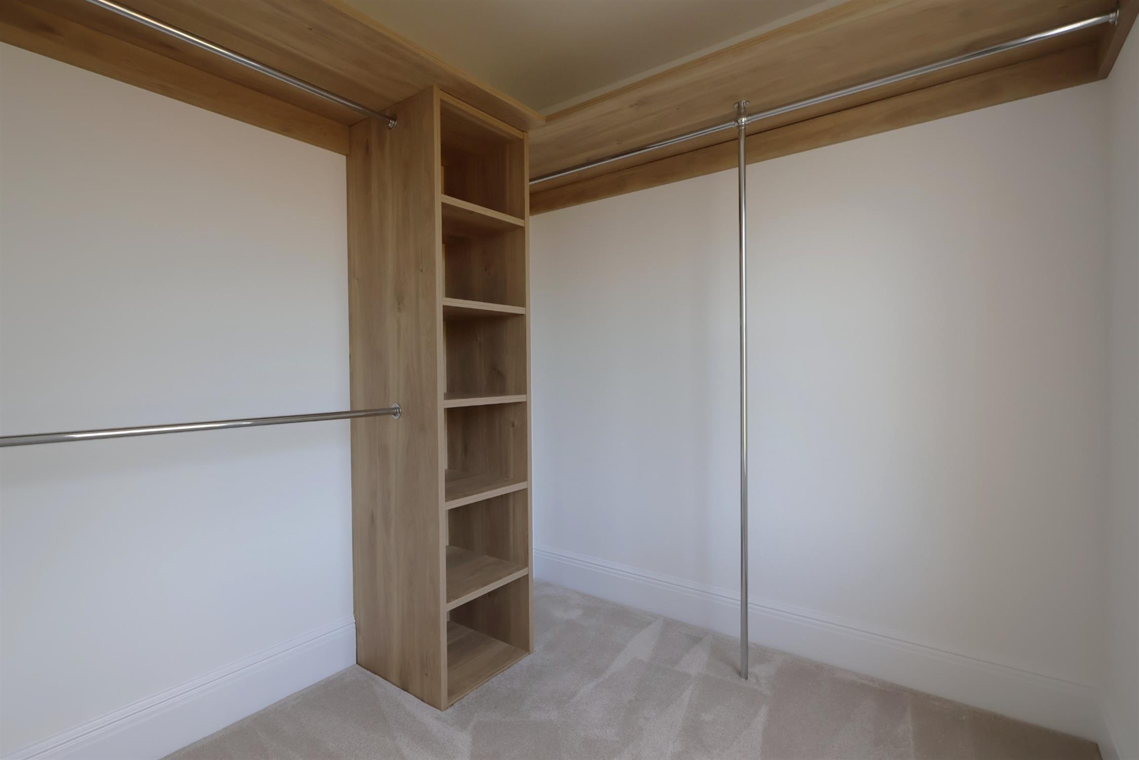WALK IN WARDROBE: His and hers hanging rails and shelving unit, front aspect, double-glazed vertical sliding window.