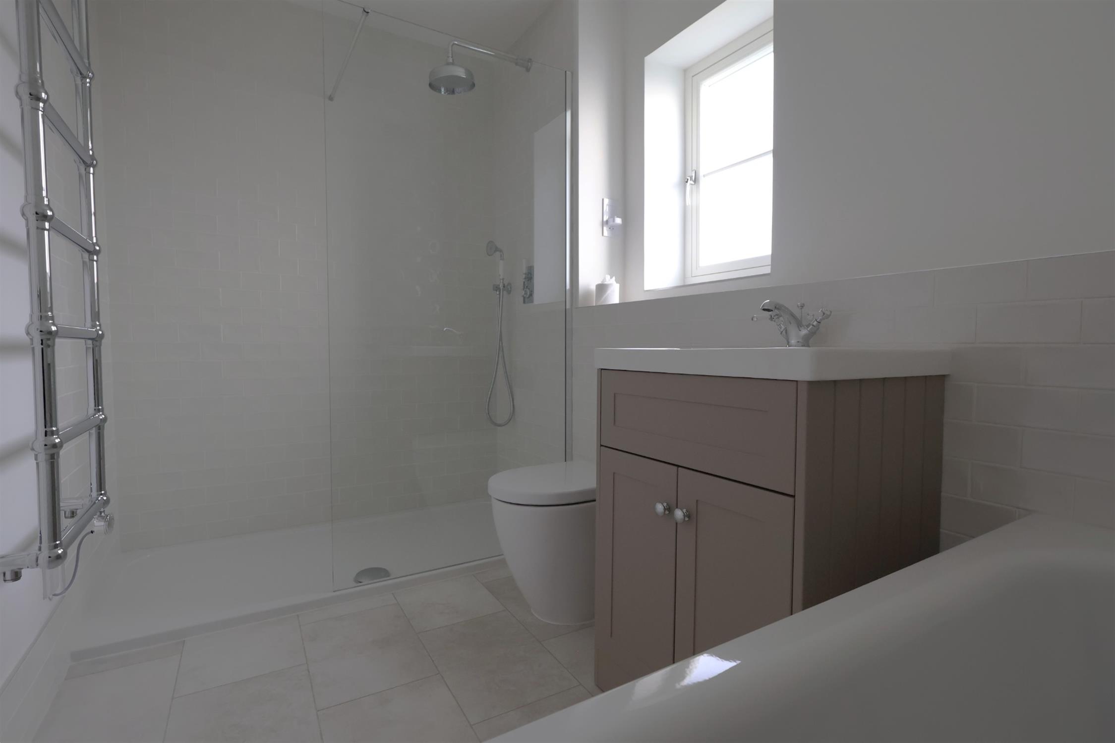 BATHROOM: White suite comprising, bath, W.C, wash hand basin with vanity unit under, walk in double shower, chrome heated towel rail, rear aspect double-glazed window