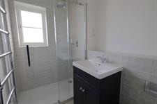 BATHROOM: White suite comprising, bath, W.C, wash hand basin with vanity unit under, walk in double shower, chrome heated towel rail, rear aspect double-glazed window