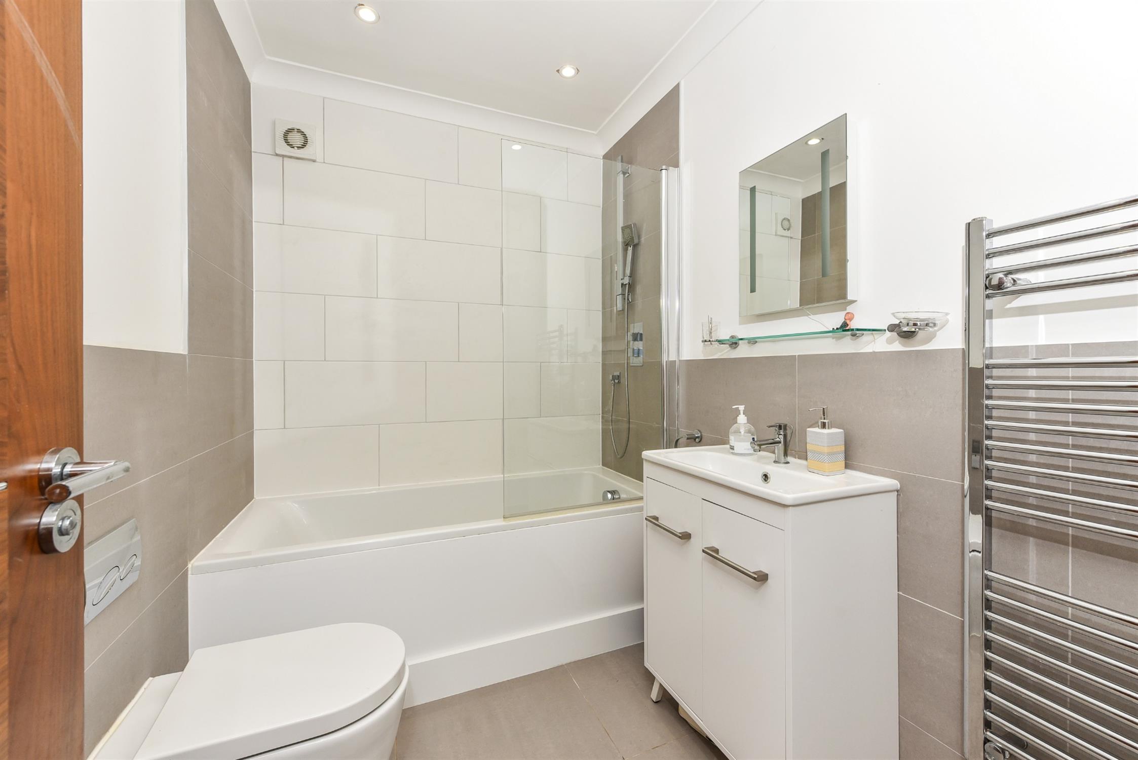Inset spotlights, extractor fan, panelled bath with shower over and screen, wash hand basin with cupboards beneath, WC, ladder radiator, part tiled walls, tiled floor.