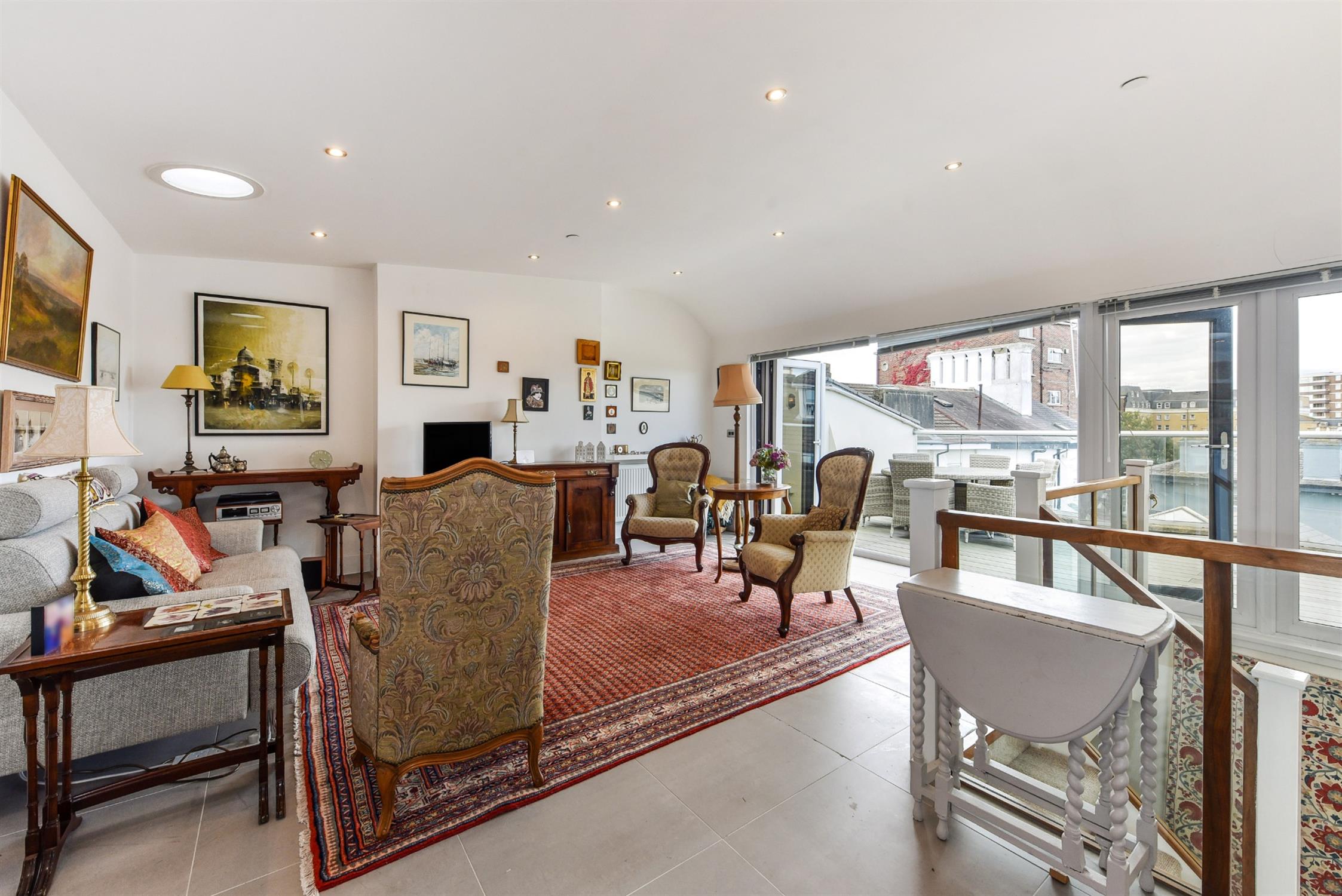 Inset spotlights, three lightwell tubes, two radiators, double glazed bi-folding doors onto terrace, tiled floor.