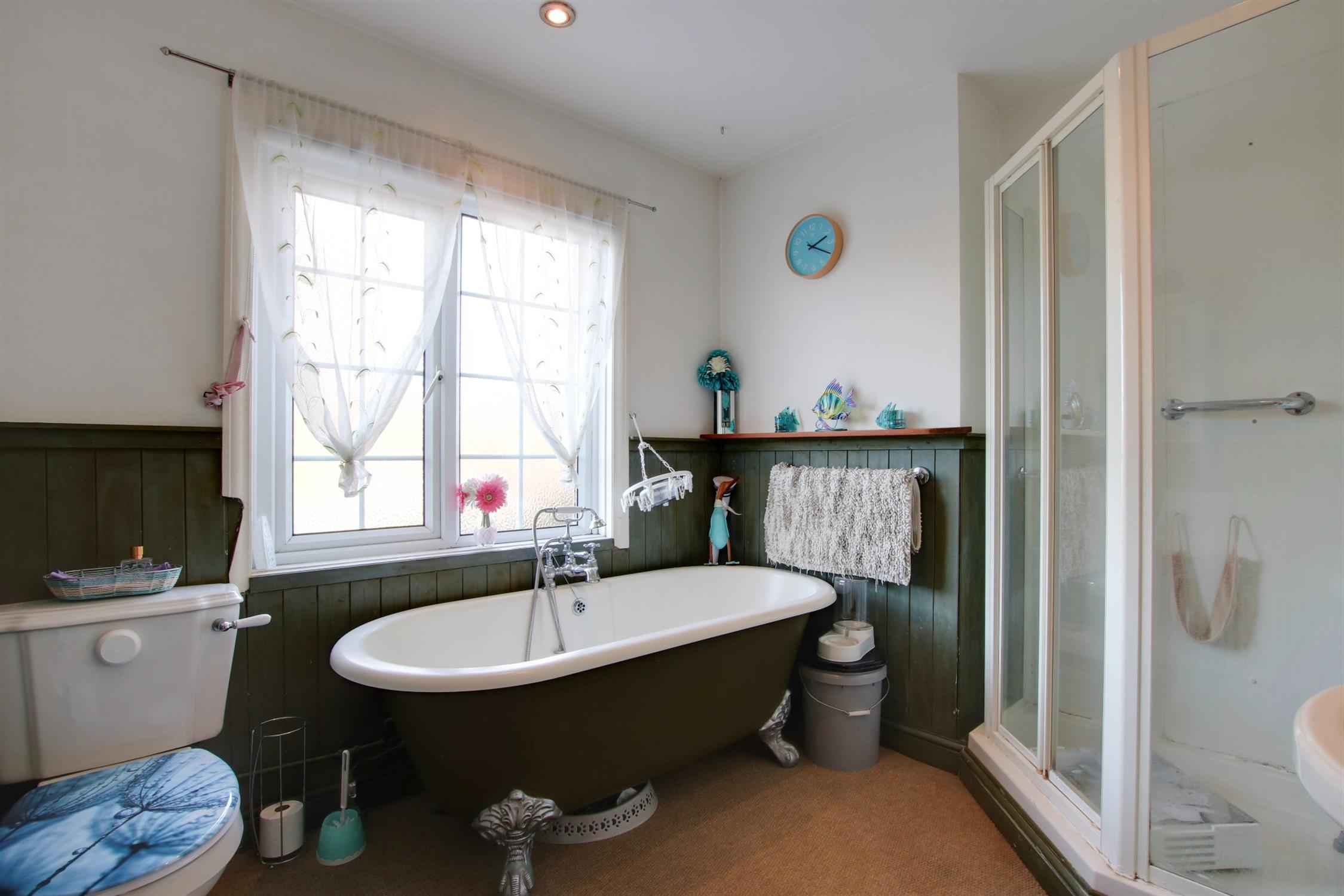 Double glaze window to rear elevation. Four piece bathroom comprising; freestanding Victorian style clawed foot bath. Low level close coupled WC. Quadrant shower cubicle. Pedestal wash hand basin. Tongue and groove cladding to dado level. Inset ceiling spotlights. Radiator.