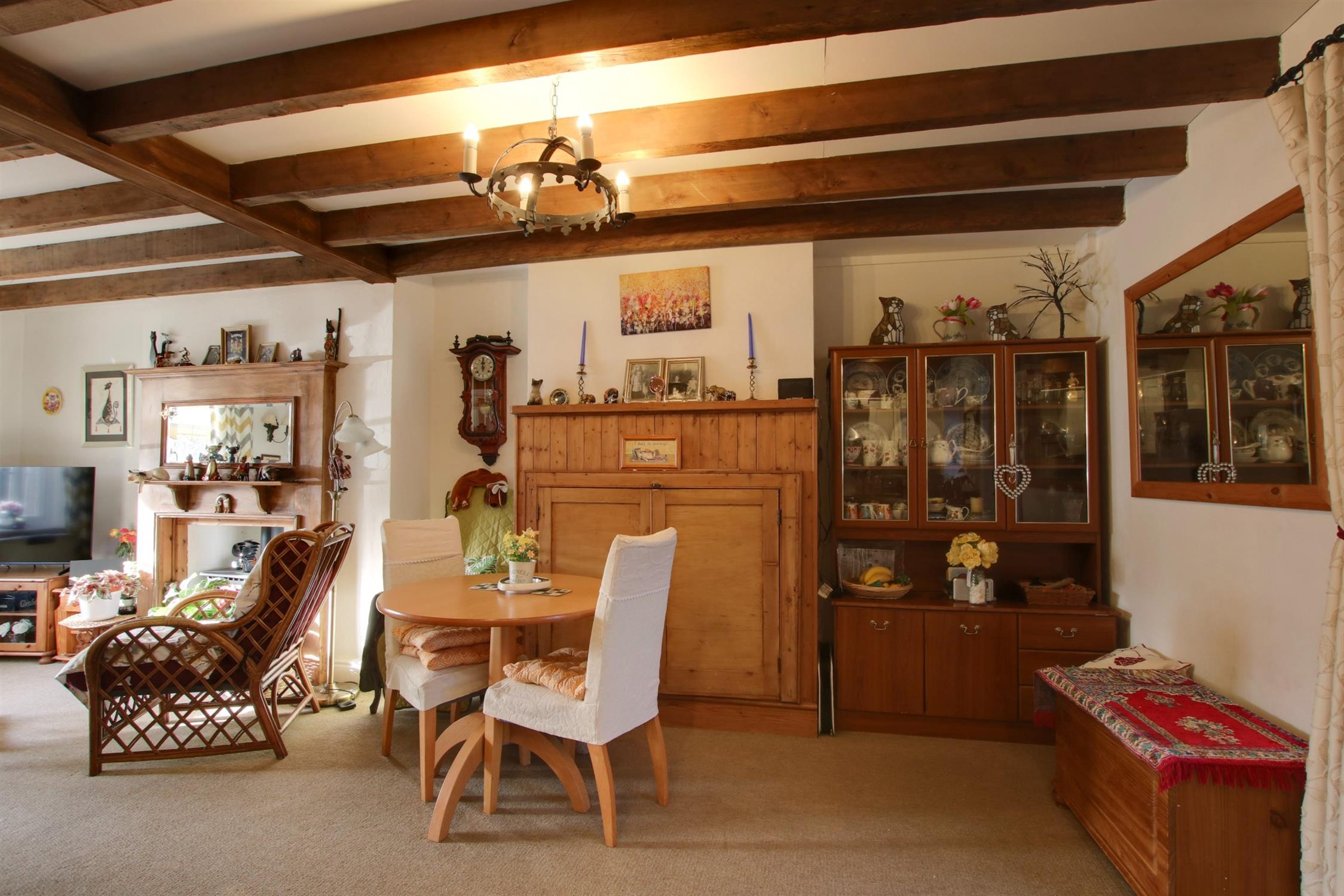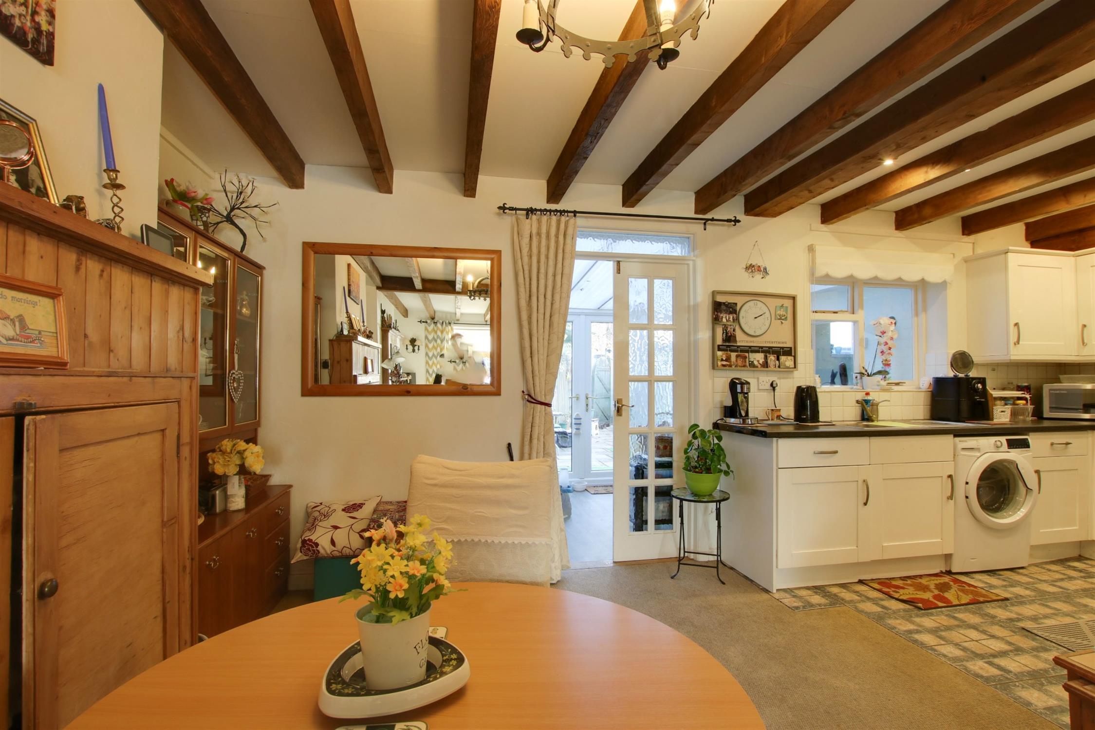 Double glazed window to front elevation and glazed double doors leading to conservatory. Chimney breast with fitted gas stove set into wooden fireplace surrounds. Beamed ceiling. Radiator. Feature shelved wall. Storage cupboard built into second chimney breast in dining area. Open plan to: