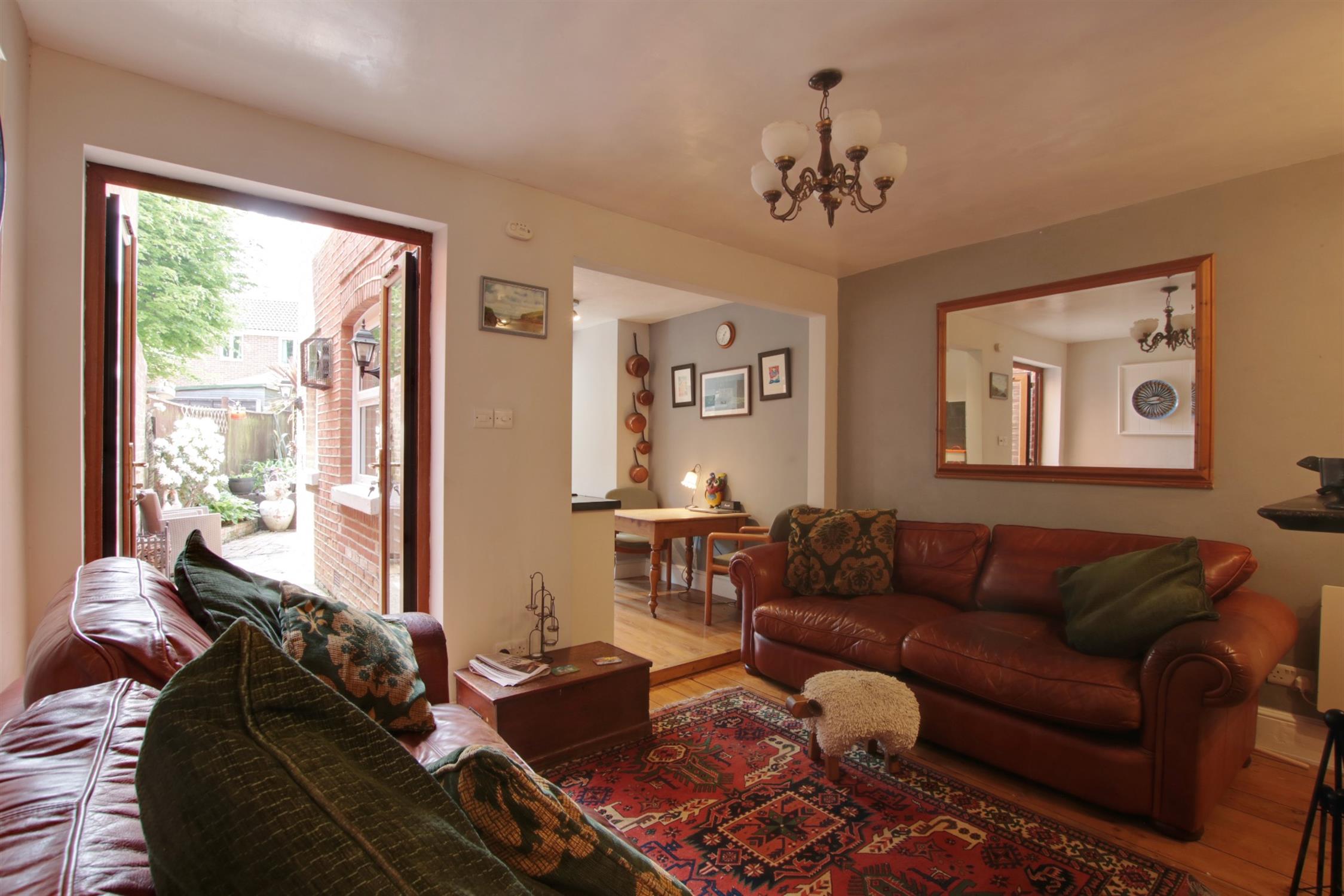 Double glazed French doors leading to rear garden. Exposed floorboards. Chimney breast with multi-fuel stove. Display shelving either side of chimney breast. Understairs storage cupboard. Electric panel heater. Open plan to: