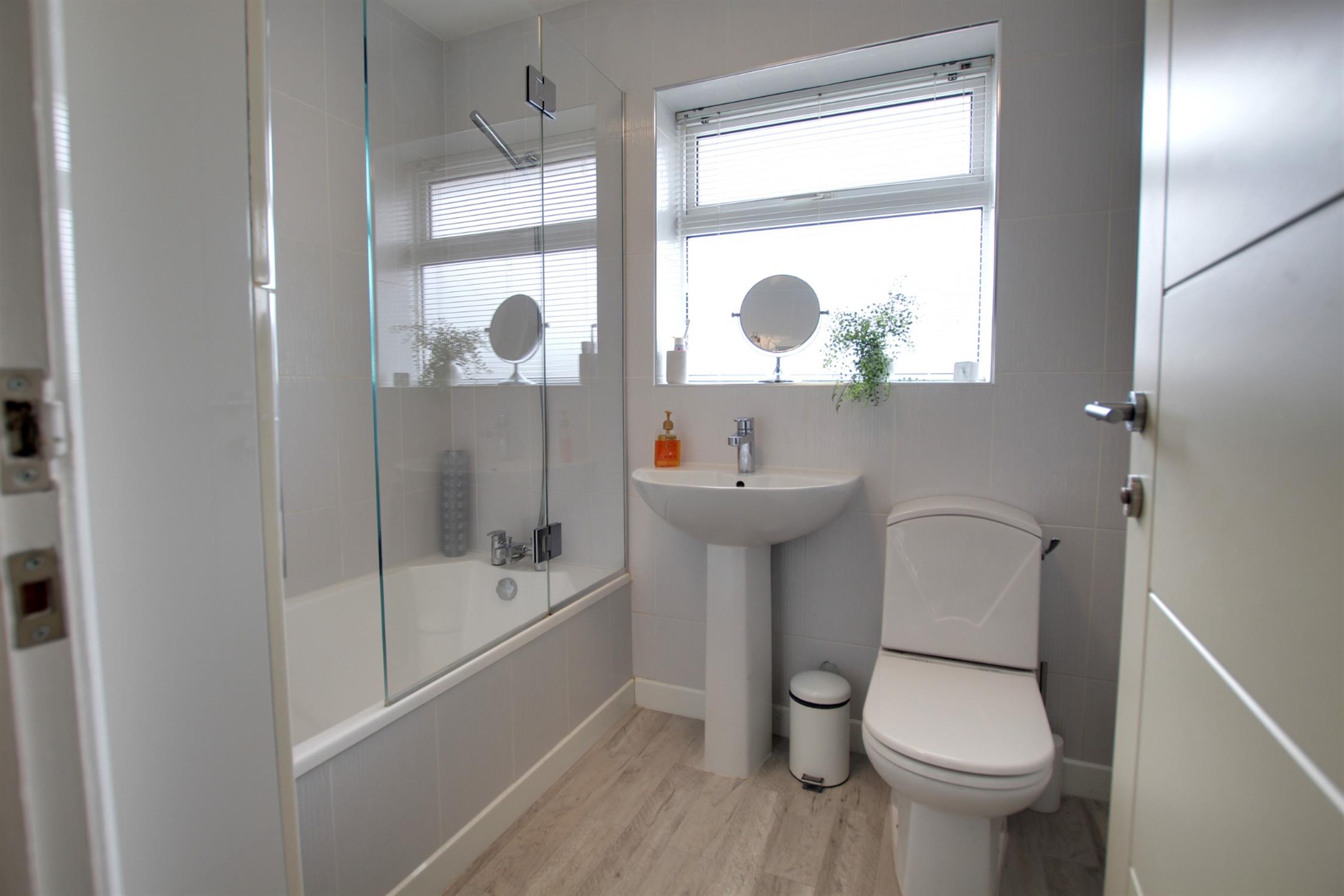 Fully tiled. Luxury suite comprising panel bath with mixer taps and shower attachment. Folding glazed shower screen. Pedestal wash basin. Low level WC. Feature inset vanity mirror. Radiator. Obscure double glazed window to side.