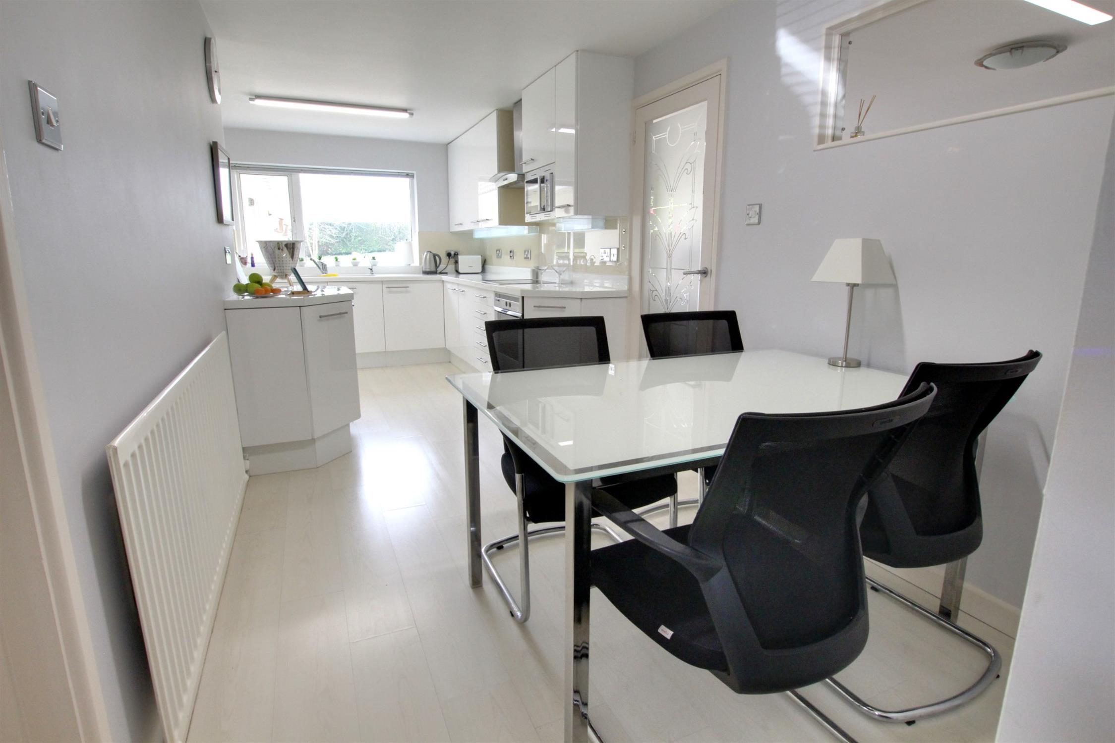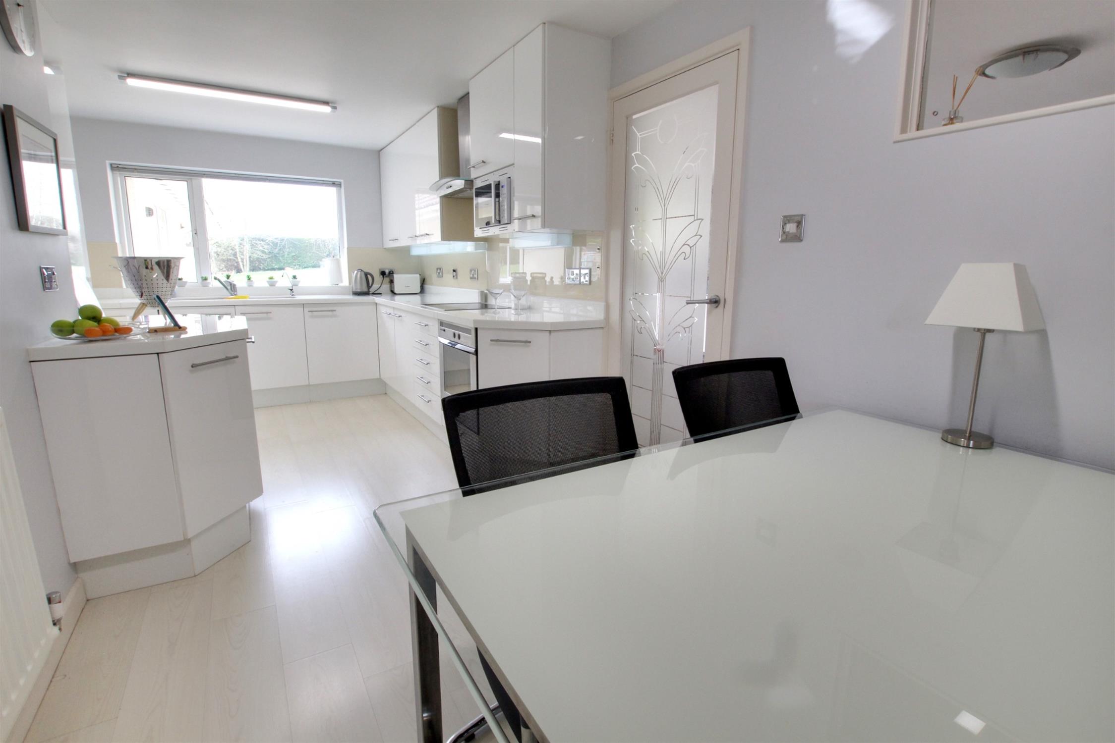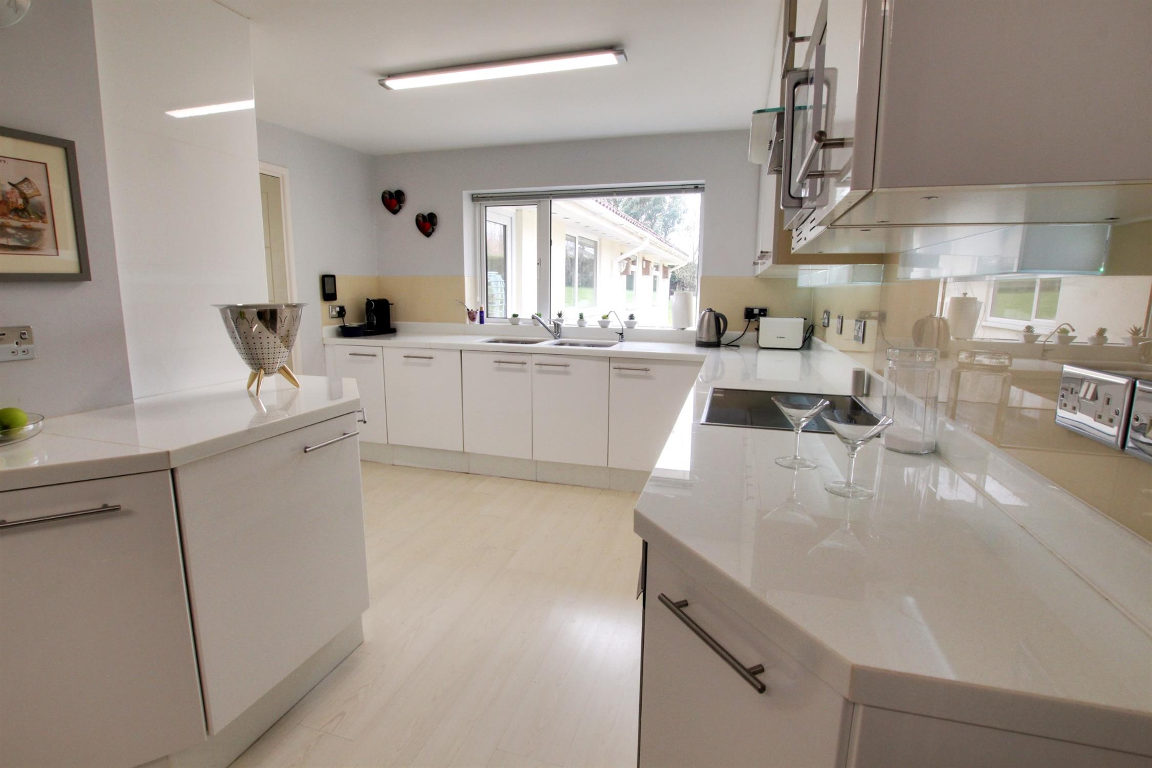 Extensive range of floor and wall units beneath illuminated fused glass work surfaces and glass wall splashbacks. Pair of inset sink units. Four ring electric hob with extractor hood over. Built in Bosch self cleaning oven, integrated fridge and dishwasher. Double glazed window with views of rear garden.