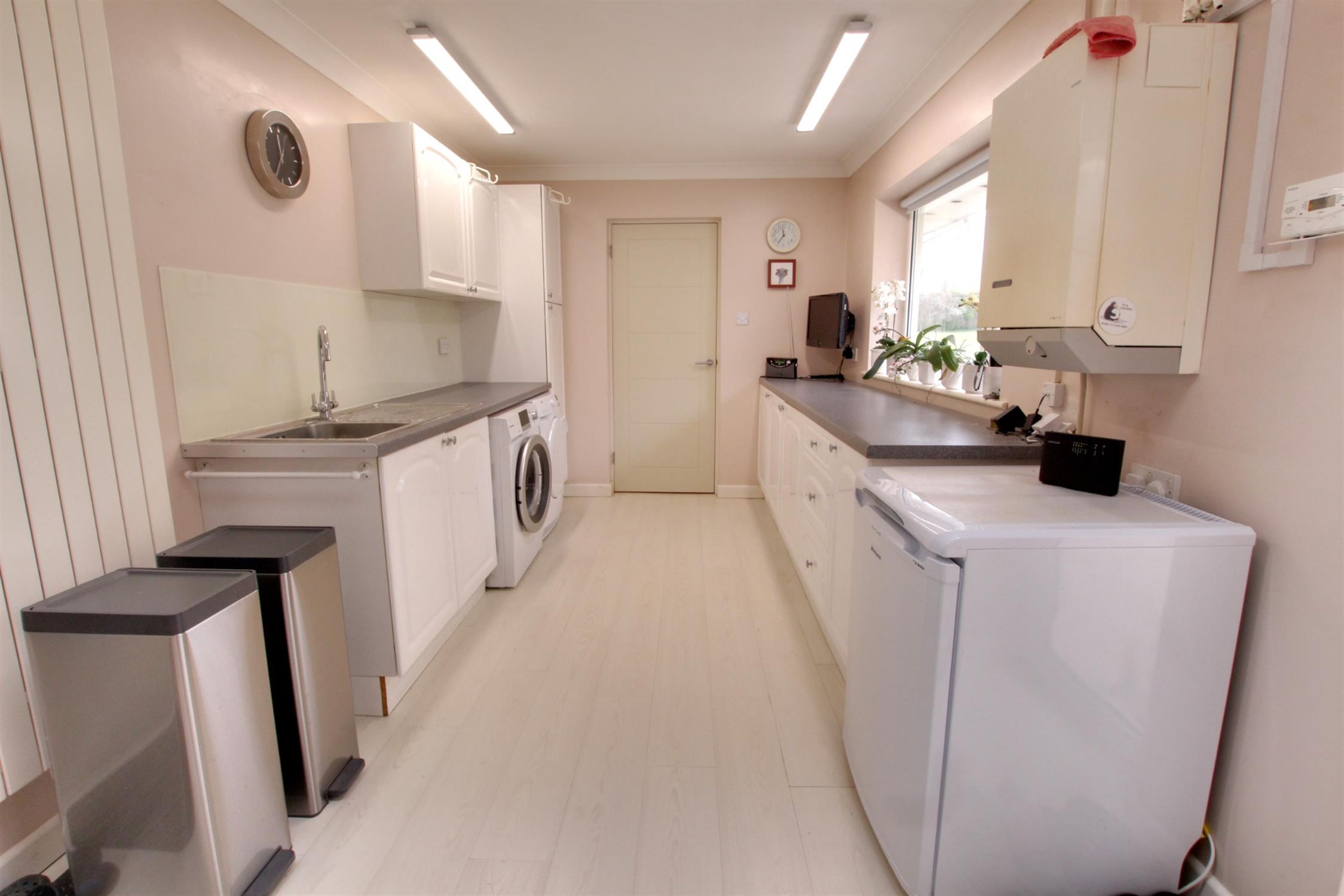 Fitted base unit to one wall with inset single drainer sink unit. Plumbing for automatic washing machine and space for tumble dryer. Additional range of fitted base units. Double glazed window and door to rear garden. Velux style window. Door to garage/workshop.