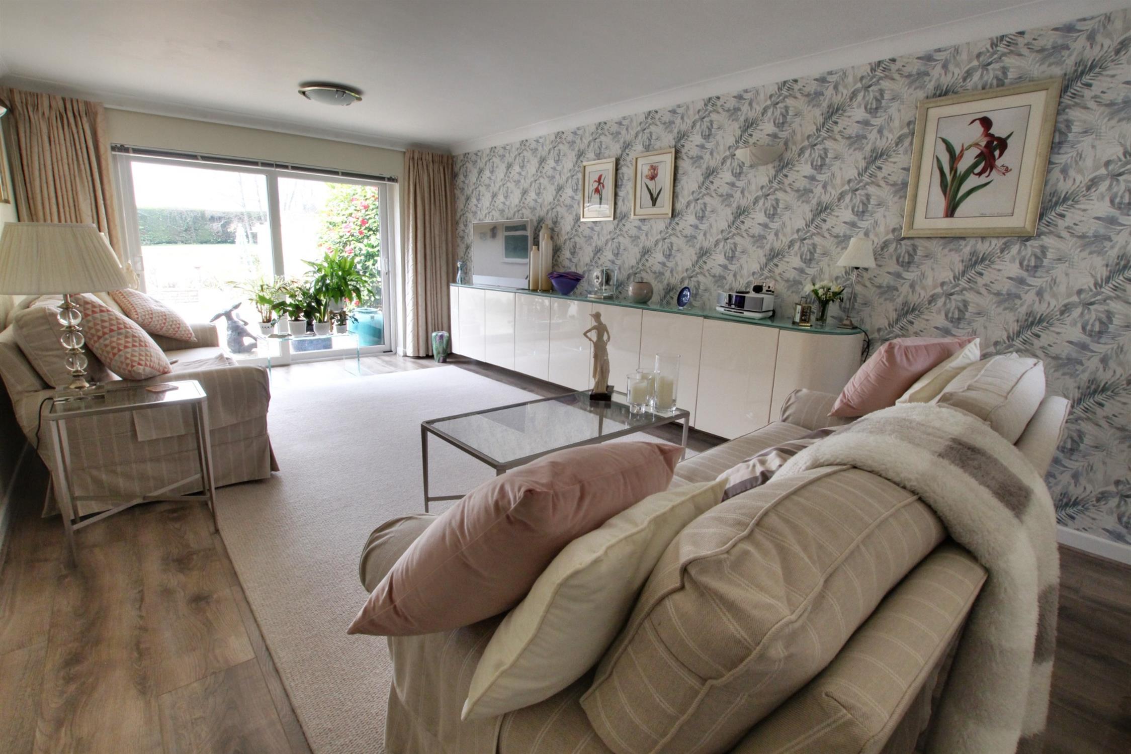 Twin aspect room with views of rear garden and double glazed patio doors opening to courtyard style entertaining area. Feature wall hung wall cupboards and display unit.