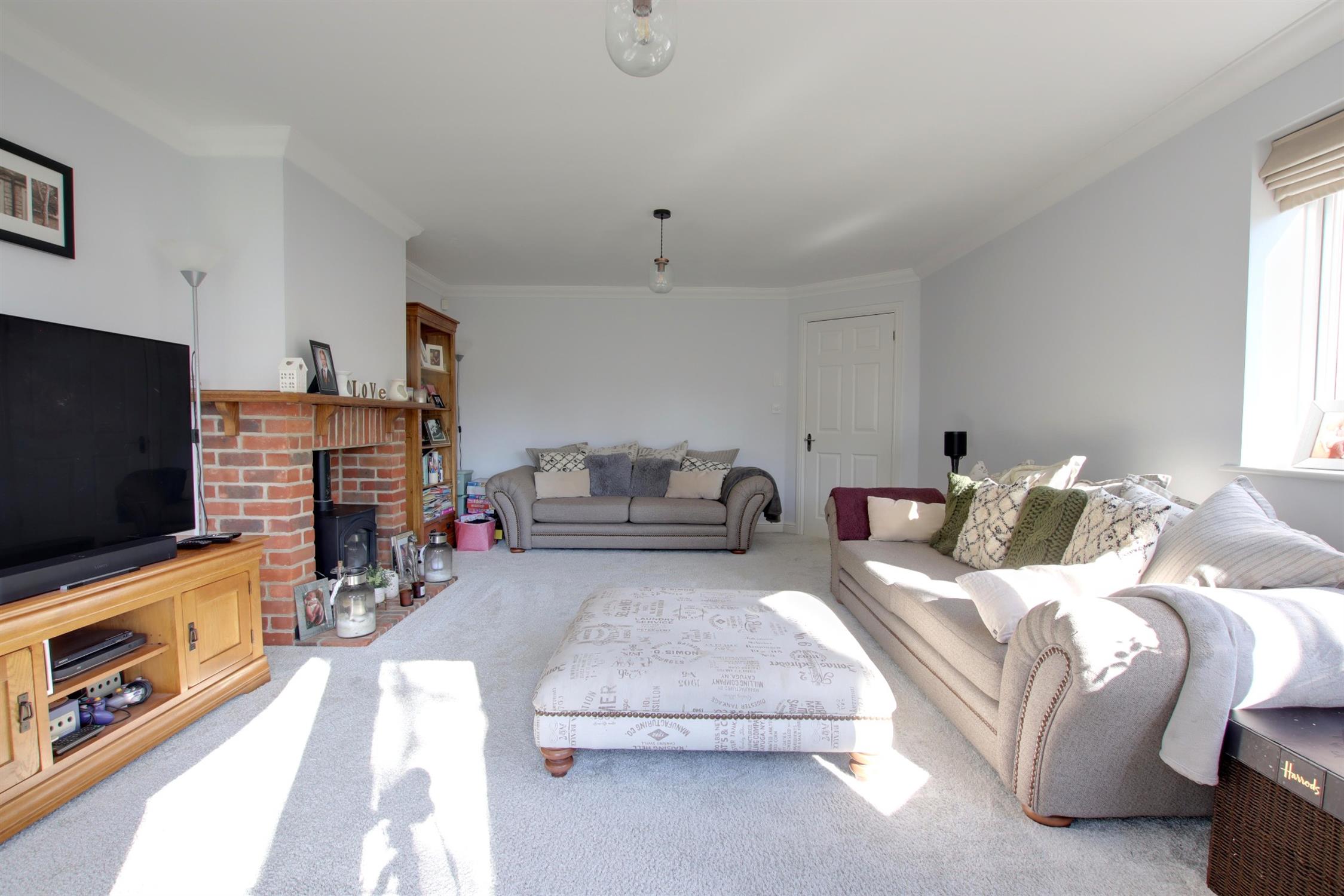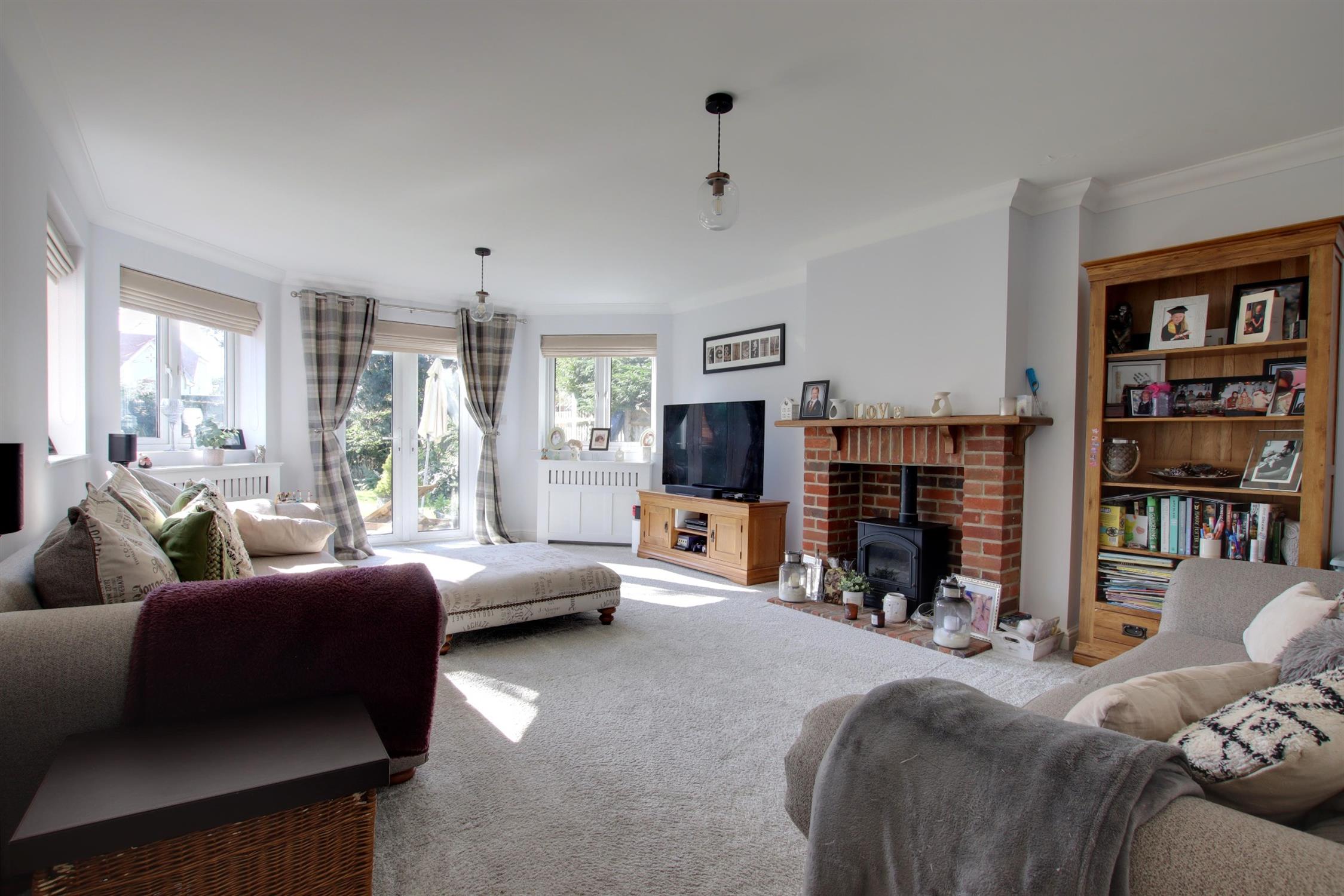 This well-proportioned room has as its focal point a gas stove set within a brick surround. Two radiators with covers. Side and rear double glazed windows and double glazed French doors opening onto the garden.