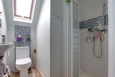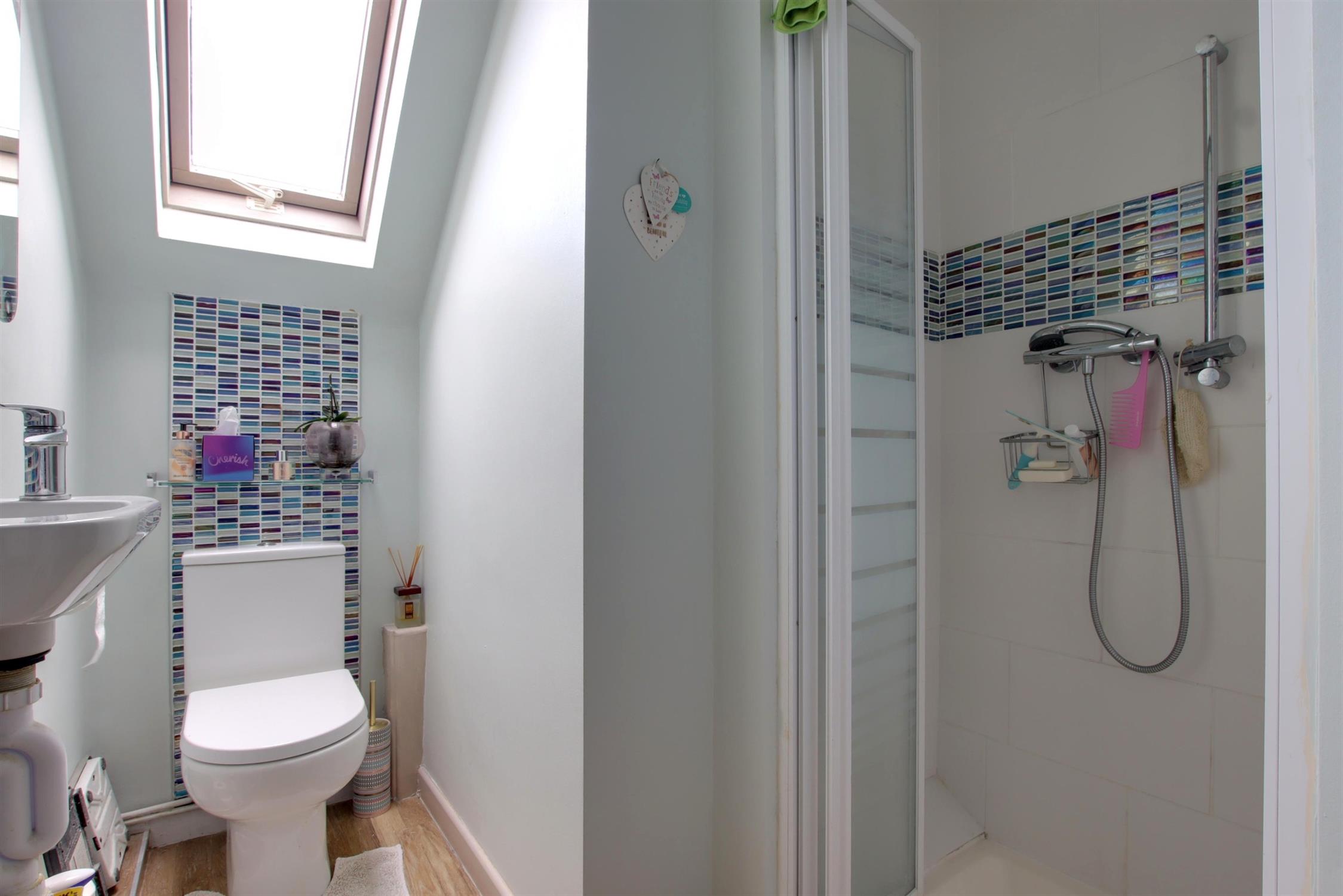 Skylight to the side aspect. Smooth ceiling. Suite comprising; shower cubicle. Low level WC. Wash hand basin. Heated towel rail. Part tiled walls. Wood effect luxury vinyl tiled flooring.