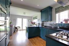 Double glazed door and French doors leading to the rear garden and two double glazed windows to the side aspect. Matching wall and base units with contrasting worktops. Inset sink and half drainer. Four ring gas hob with a glass splashback and extractor hood above. Fitted double oven. Integral fridge/freezer. Slimline dishwasher and washing machine. Radiator. Wood effect luxury vinyl tiled flooring. Wall mounted ‘Worcester’ boiler within wall unit.