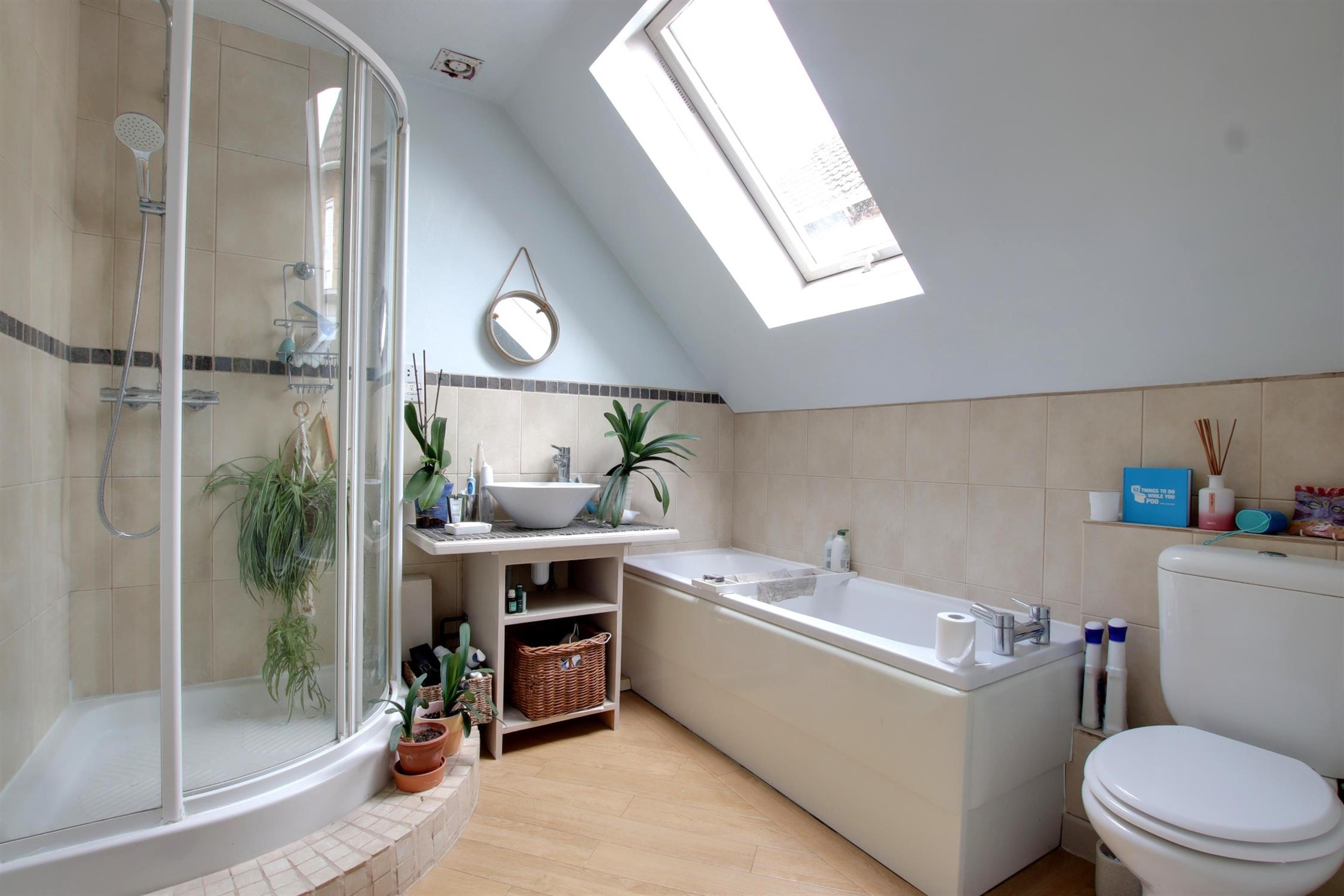 Double glazed skylight and inset spotlighting. Suite comprising; bath, shower cubicle, wash hand basin and low level WC. Heated towel rail. Part tiled walls. Wood effect luxury vinyl tiled flooring.