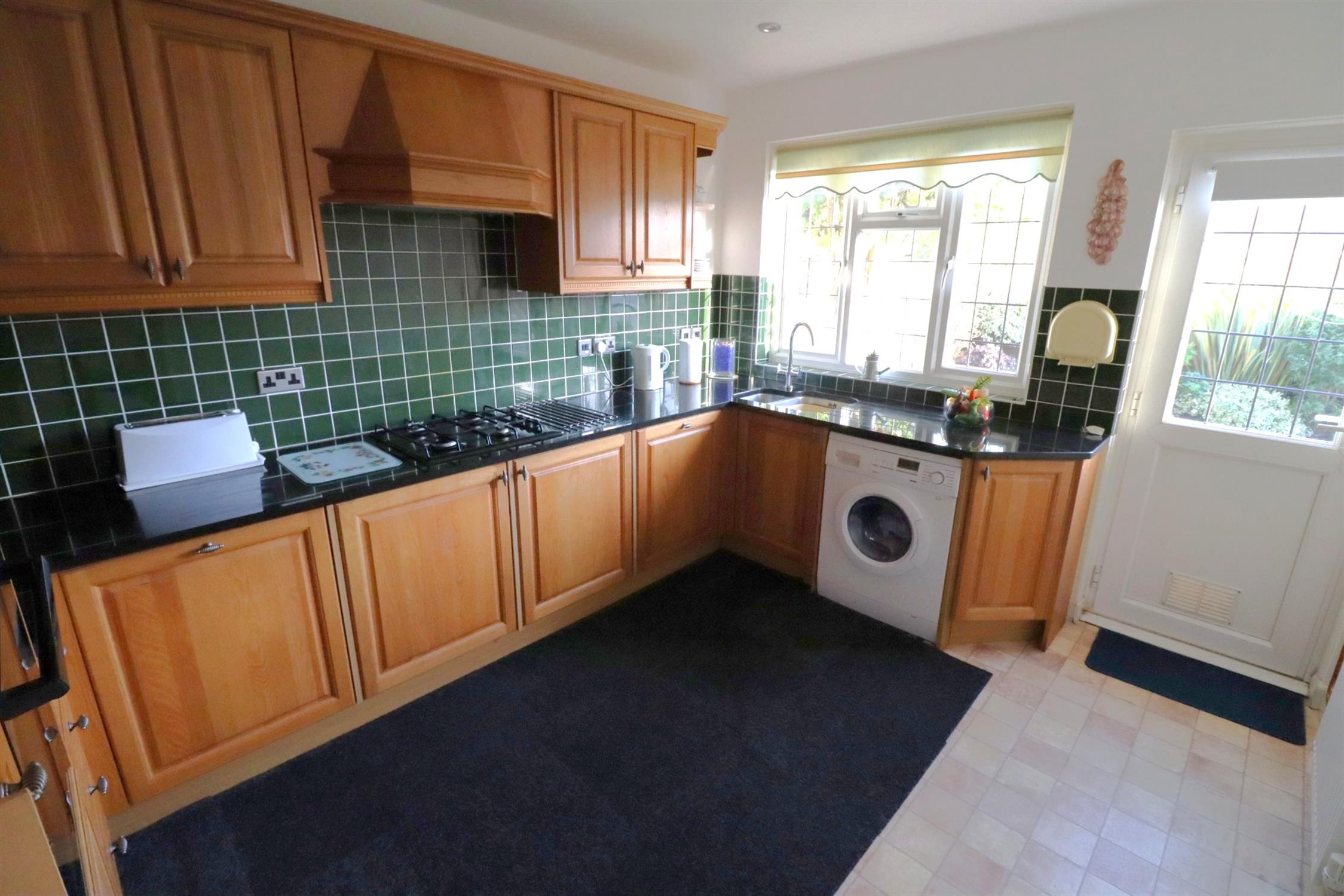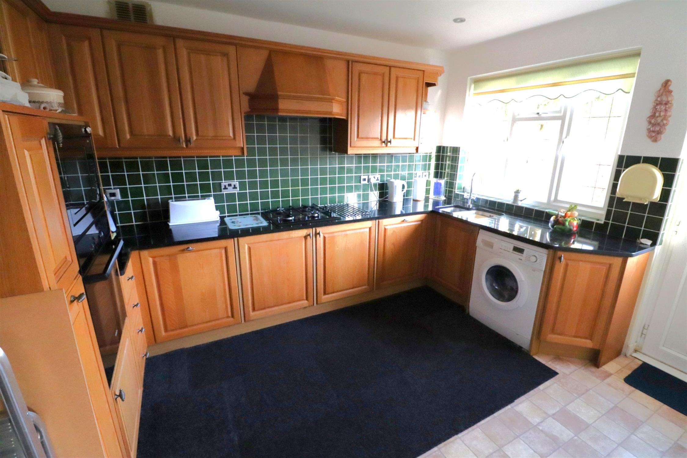 Double glazed window and door to rear garden, matching range of wall and base units with granite worksurfaces, under mounted stainless steel one and half bowl sink with mixer tap and drainer grooves, gas hob, overhead extractor, electric oven and grill, built-in dishwasher, fridge/freezer and washing machine.