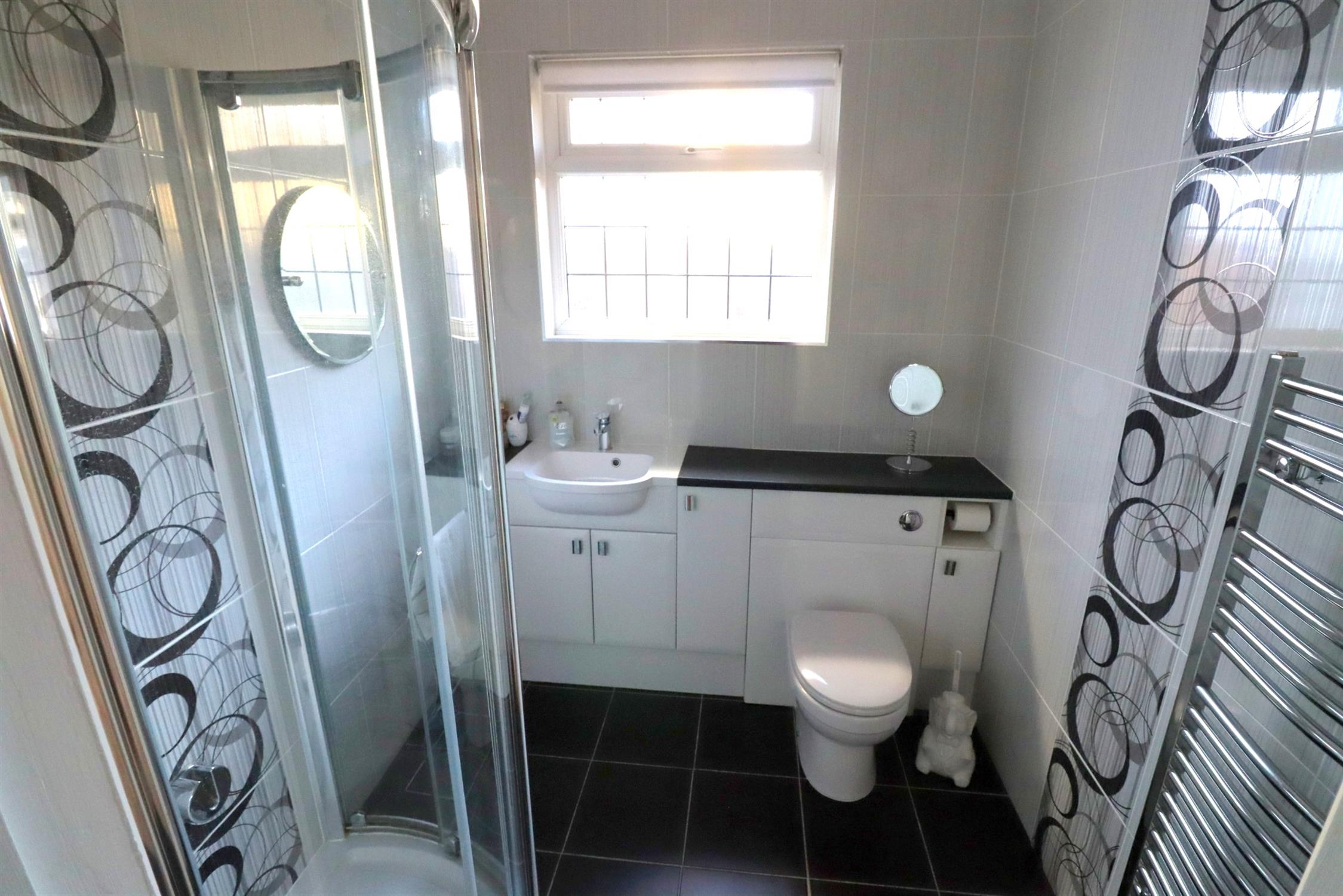 Opaque double glazed window to side, WC, tiled corner shower cubicle, hand basin, ladder style towel radiator, ceiling light, extractor, tiled walls and flooring.
