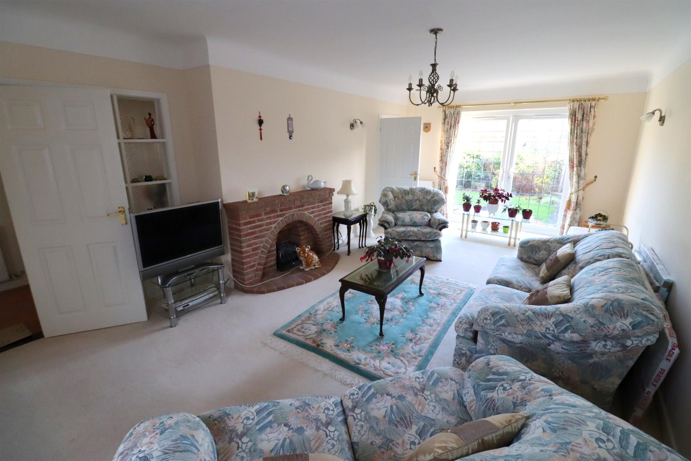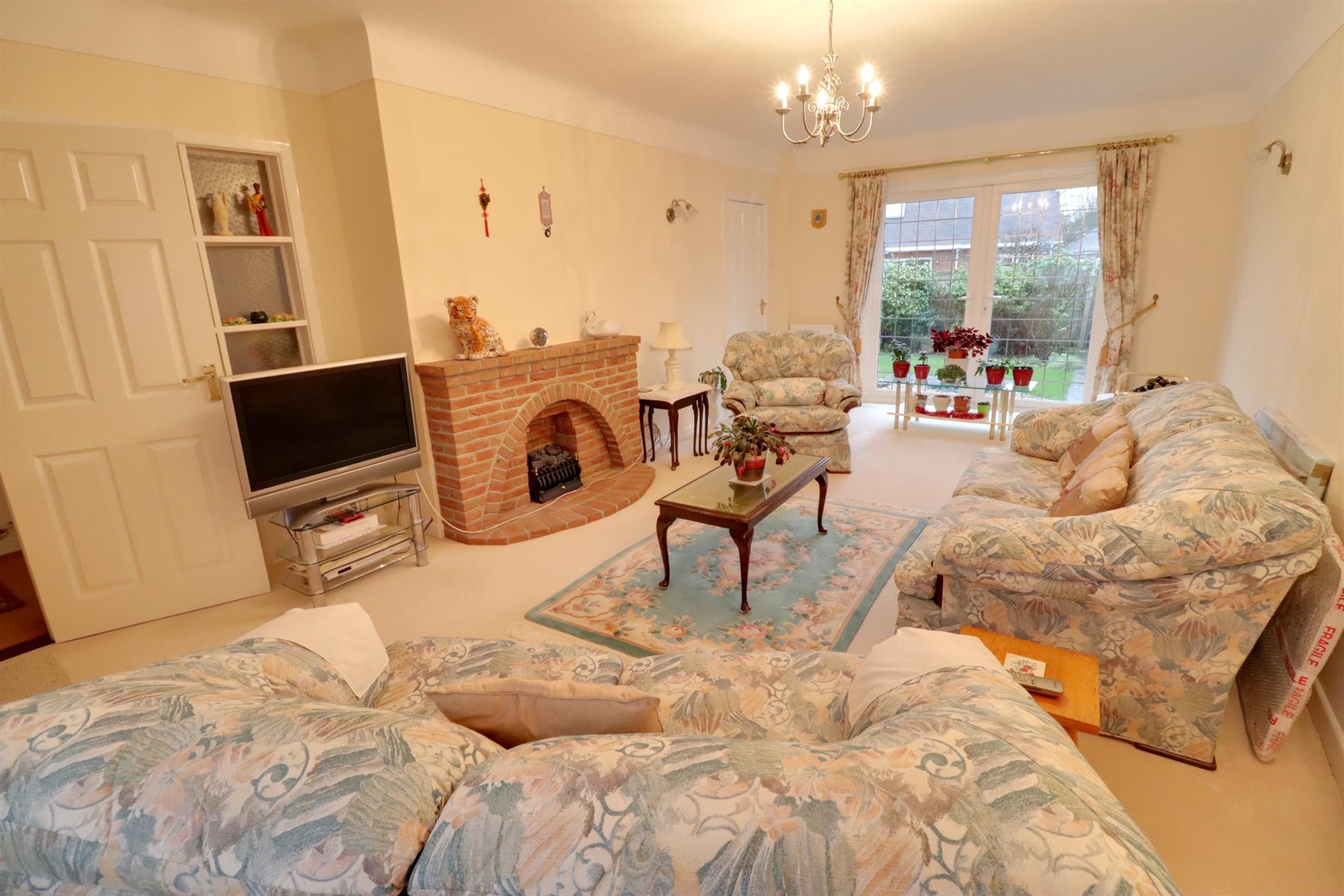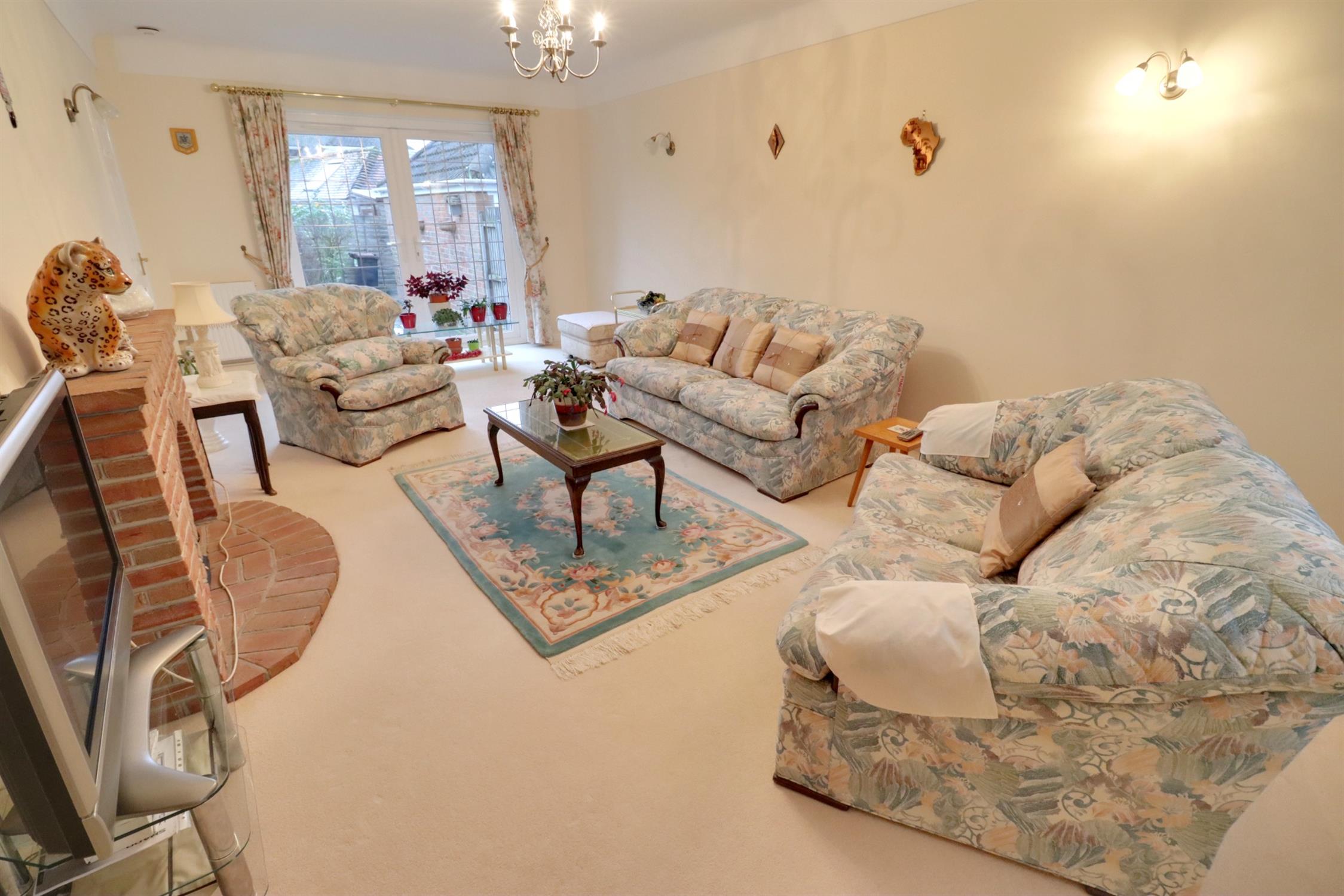Double glazed windows to front, double glazed patio doors to rear garden, two radiators, brick built fireplace and hearth with inset electric fire.