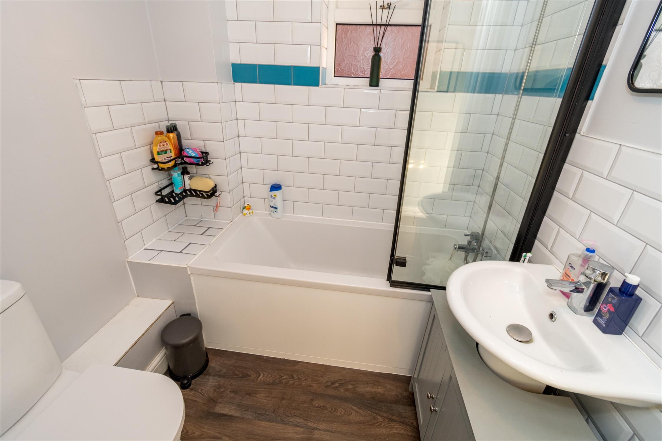 Lino flooring. Partially tiled walls. Panel enclosed bath with shower. Low level W.C and basin. Electric heater.