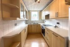 KITCHEN – Range of fitted units, electric oven and hob, freestanding fridge freezer and 1 ½ sink with drainer.
