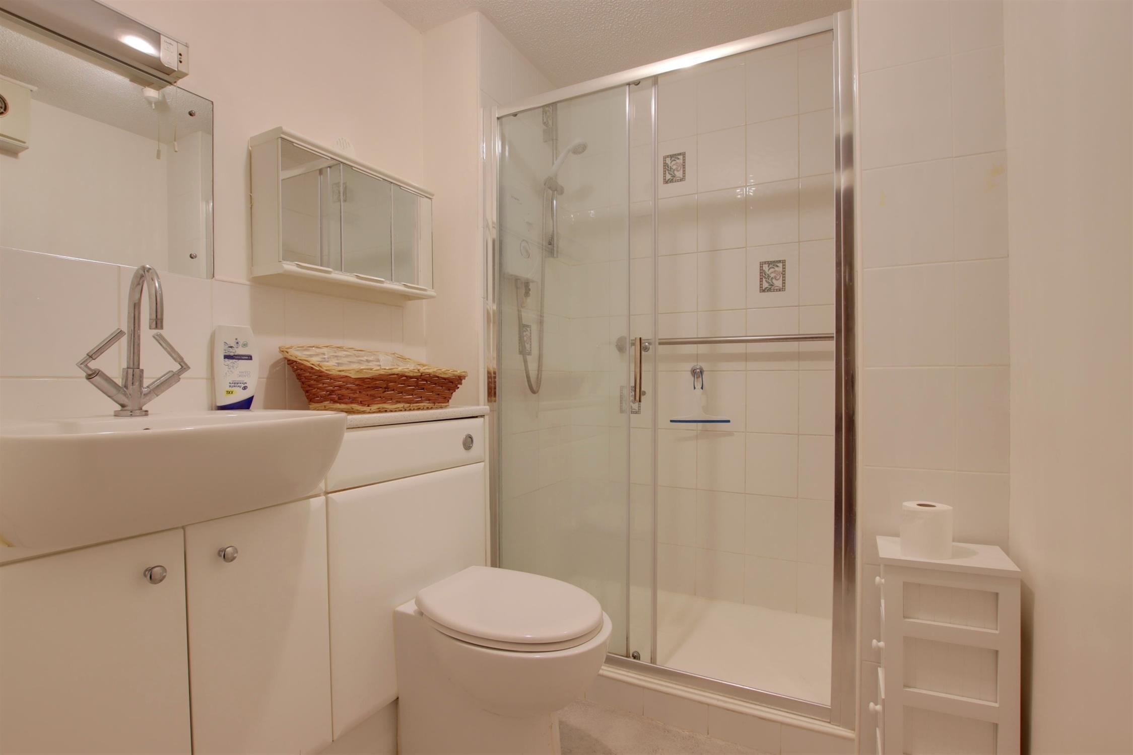 Suite comprising shower cubicle. Large shower cubicle with grip handle. Vanity unit with wash hand basin and low level WC. Part tiled walls. Vinyl flooring.