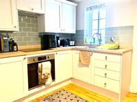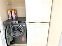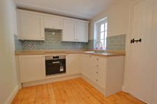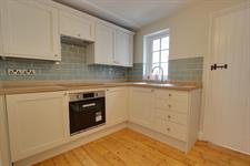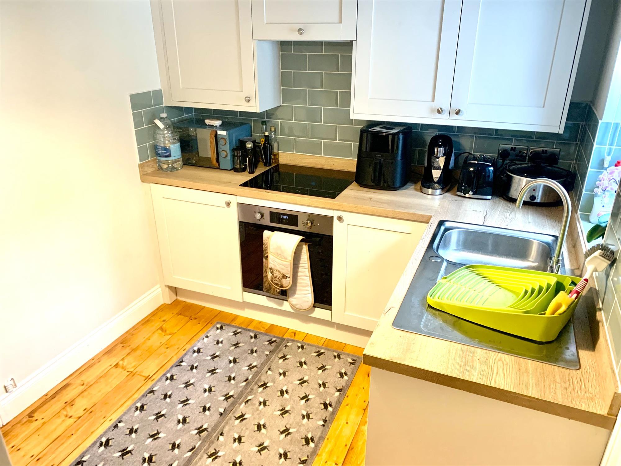 Modern wall and base units with window to rear, appliances consisting of: electric oven & hob (w/machine & fridge/freezer are in brick built). Small storage cupboards house fuseboard and there is a door to inner lobby and stairs to first floor.