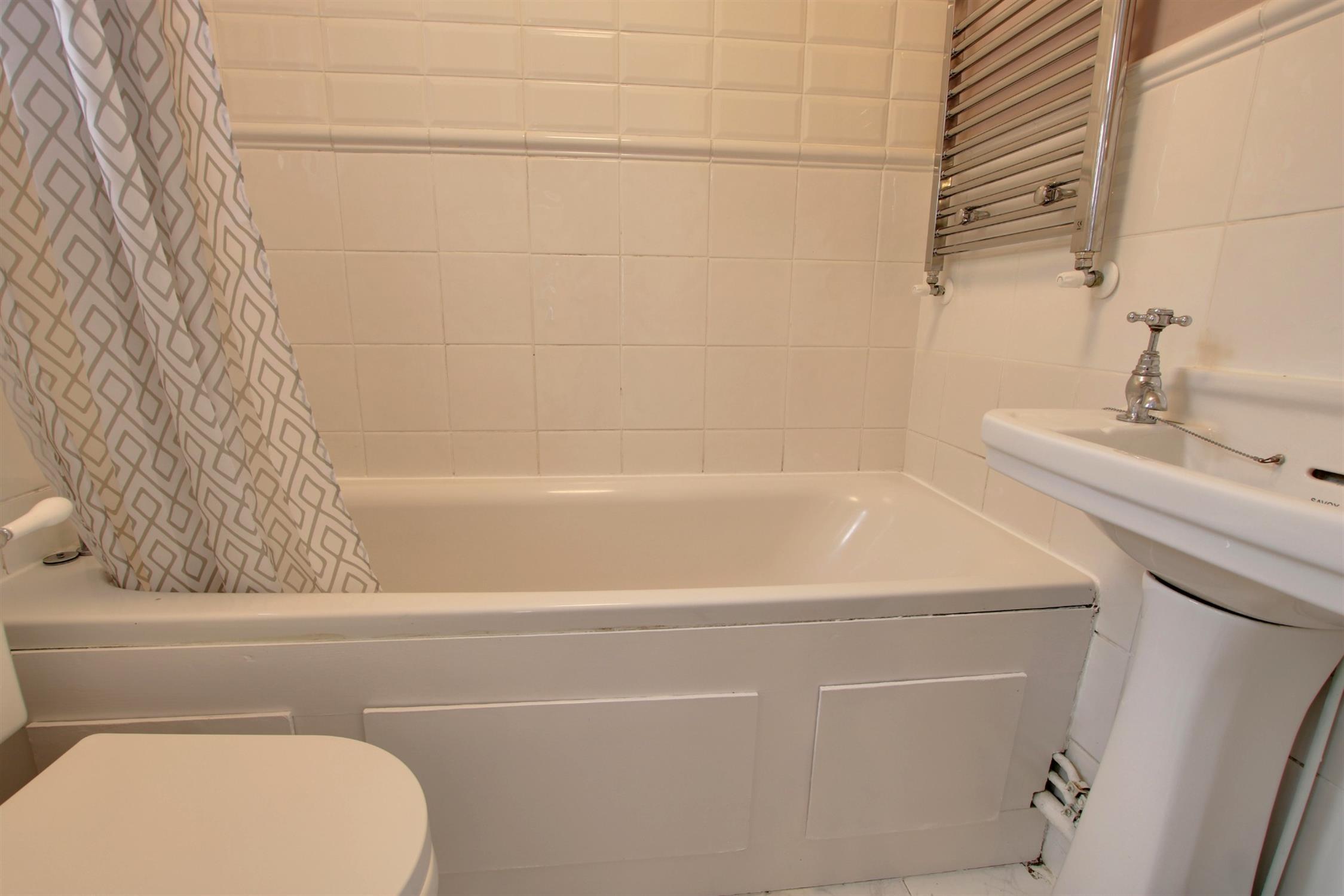 White suite with bath with shower over, sink and toilet. Window to side.